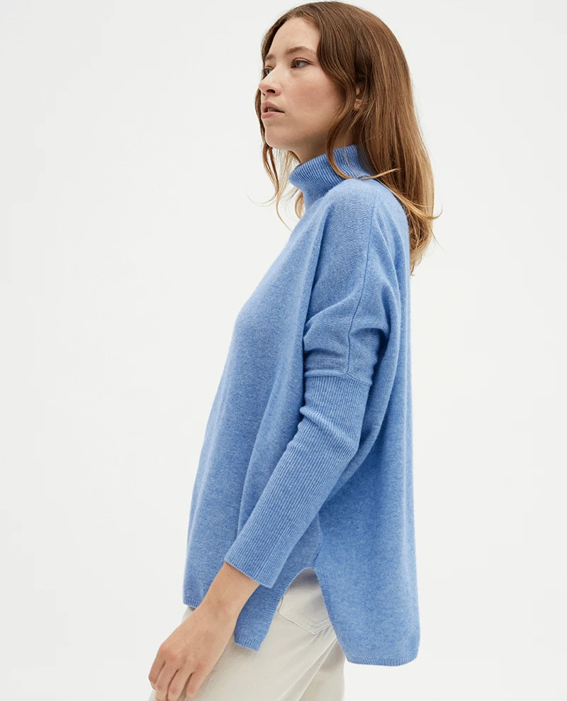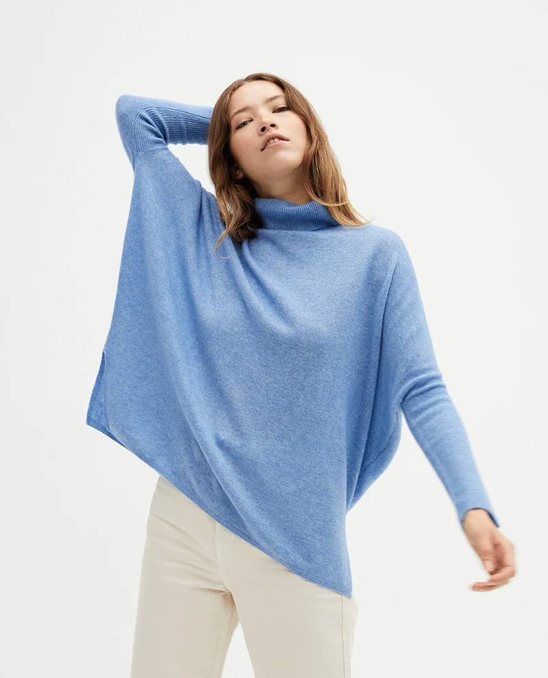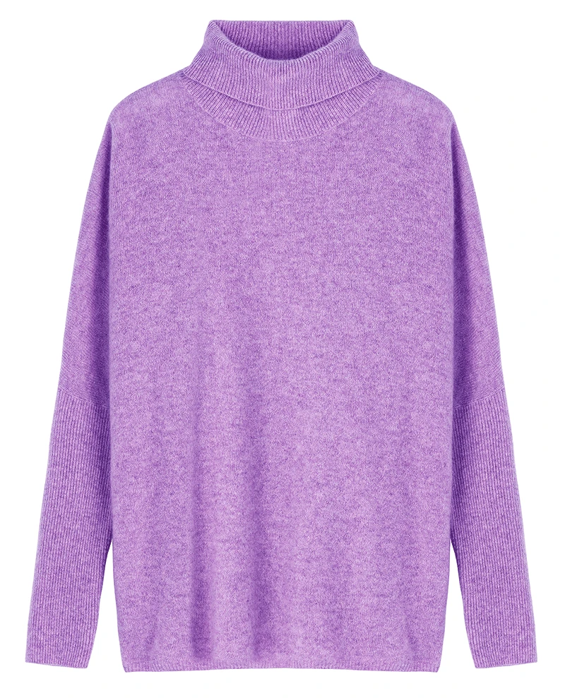 Absolut Cashmere Clara Lilac Knit, a light purple cashmere jumper with an oversized and wide poncho fit. This pastel purple knitted pullover has ribbed sleeves from the elbow to the cuff and a slit in the side seams. A super soft and cosy sweater with an oversized fit and a high roll over turtle neck.Â