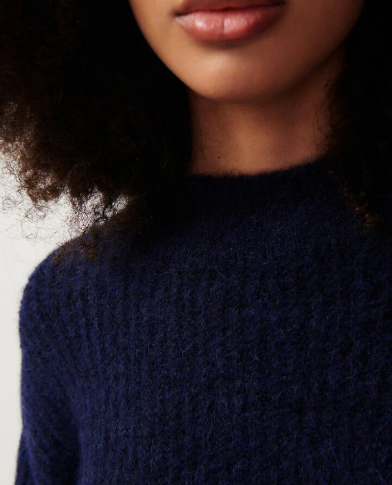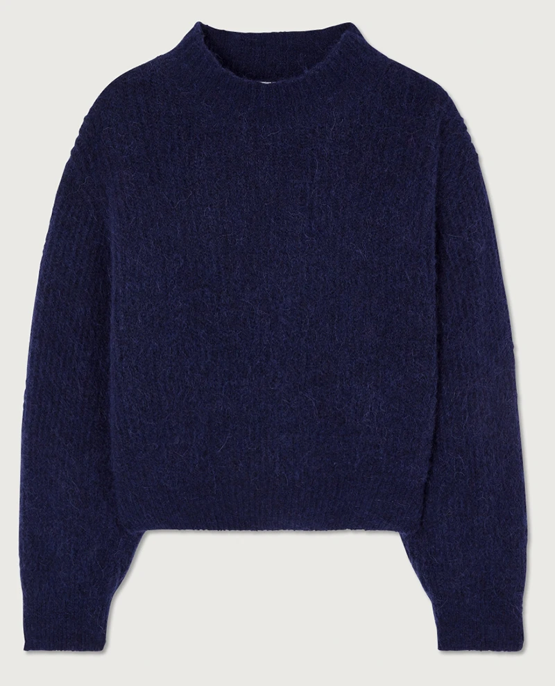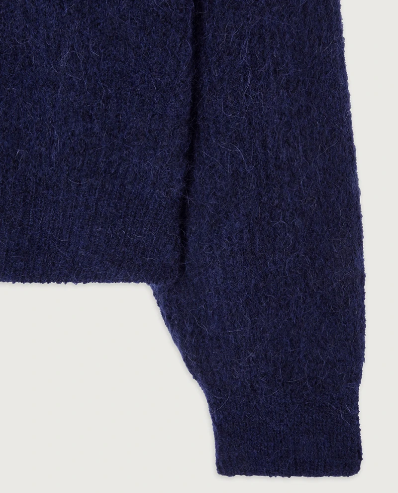 American Vintage East Navy Knit, a fluffy navy blue knitted pullover sweater with a high turtle neck and long sleeves. A casual jumper for everyday wear.Â
