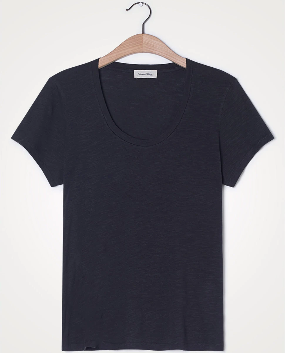 American Vintage Jacksonville U-Neck Carbon Grey T-Shirt, a dark charcoal grey cotton tee with a rounded U shaped neckline. This flattering everyday casual t-shirt has a flared fit and short sleeves. Also available in acid yellow for Spring.