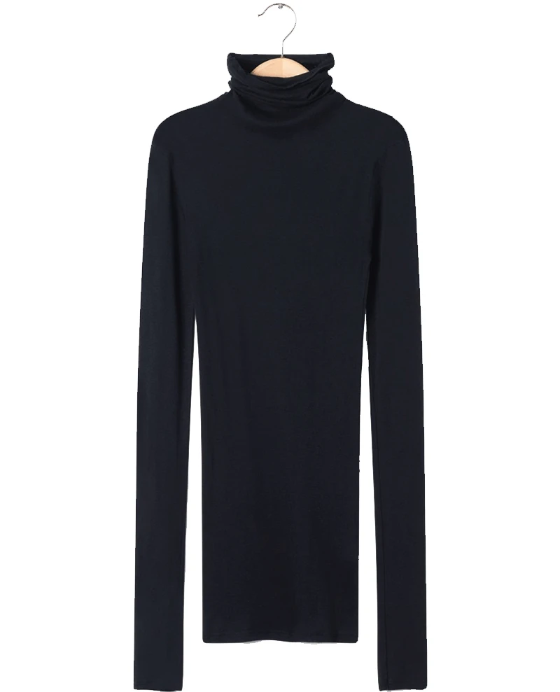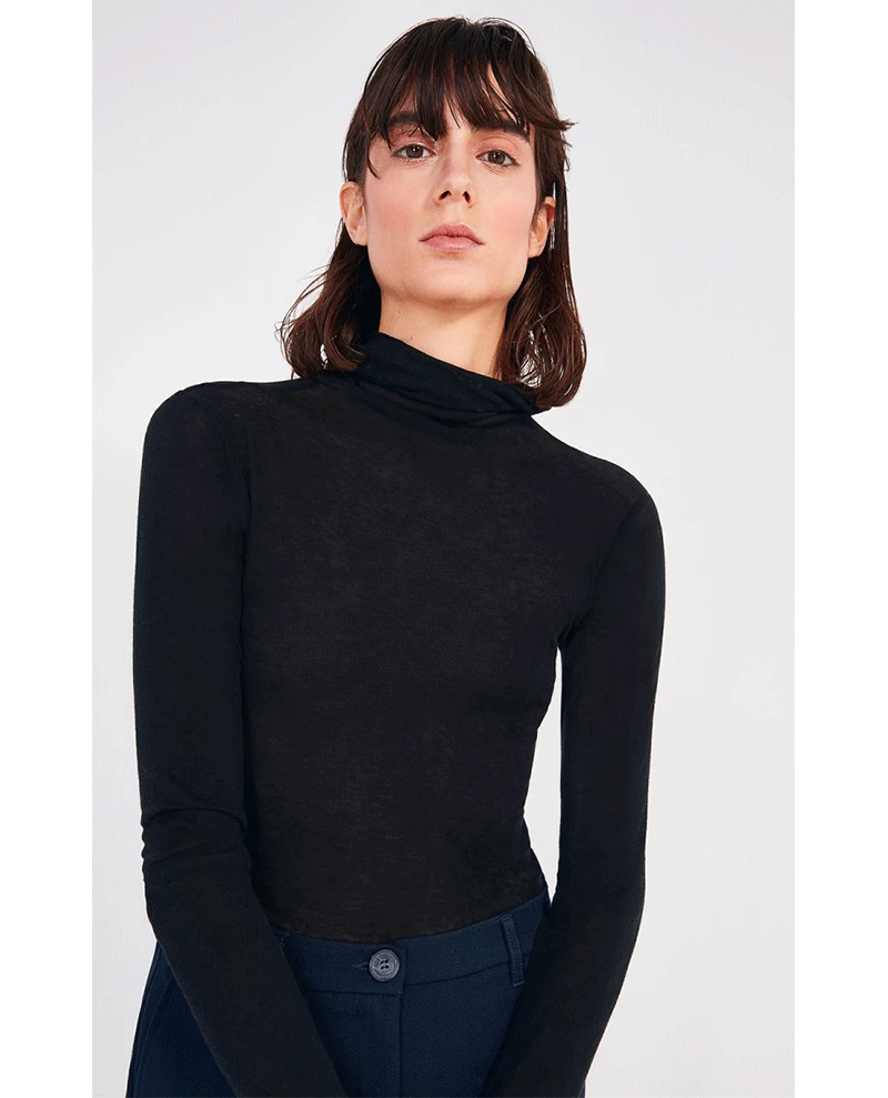 American Vintage Massachusetts Black Rollneck, a thin black polo neck tee with long sleeves and a figure hugging fit. This stretchy lightweight t-shirt can be worn alone or layered under other pieces for an extra layer in Autumn. Also available in light and bright pink.