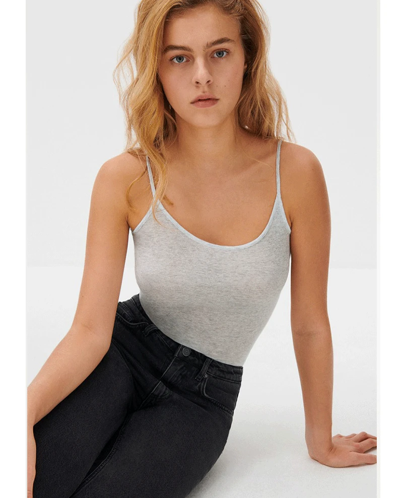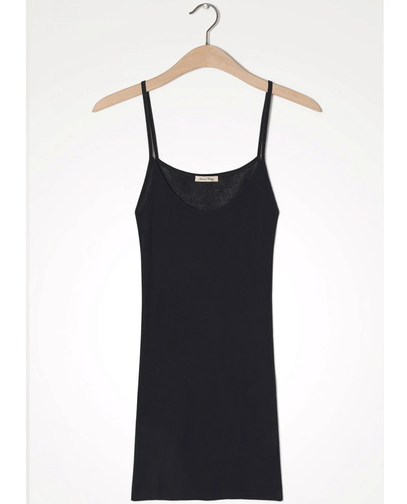 American Vintage Massachusetts Black Vest, a stretchy and fine cotton vest top with thin straps and a tight fit. Crafted from super soft and lightweight Supima high quality cotton this long length black camisole top also comes in grey and white.