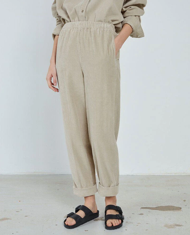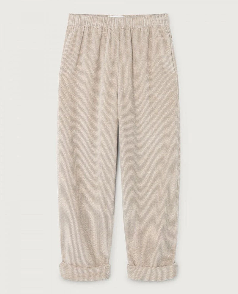 American Vintage Padow Mastic Trouser, a chalk toned pair of slouchy soft cord pants with a stretchy drawstring waist and pockets. These straight leg corduroy trousers have a relaxed fit and a turned up hem. Extra long these velvety soft trousers turn up at the ankles and feature a drawstring tie in the inside of the waistband. Available in other colours.