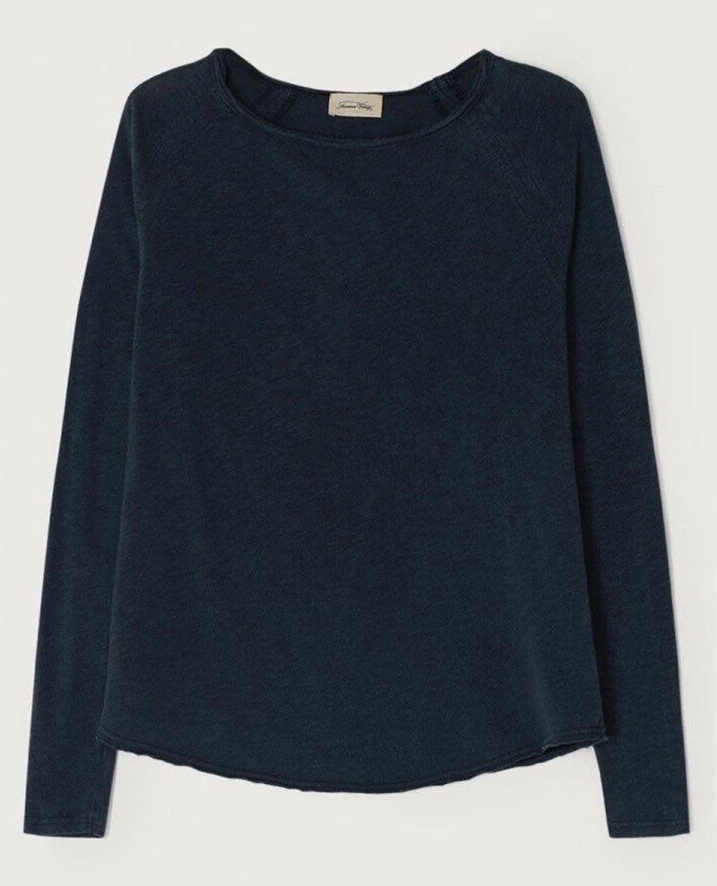 American Vintage Sonoma Cosmos Vintage L/S T-Shirt, a dark blue long sleeved cotton tee with a round wide neck and a straight relaxed fit. This simple blue pullover top is crafted from a thick cotton, making it ideal for layering. The wide neck and hem are finished with raw edges giving it a casual feel. Also available in white, black, grey and green.