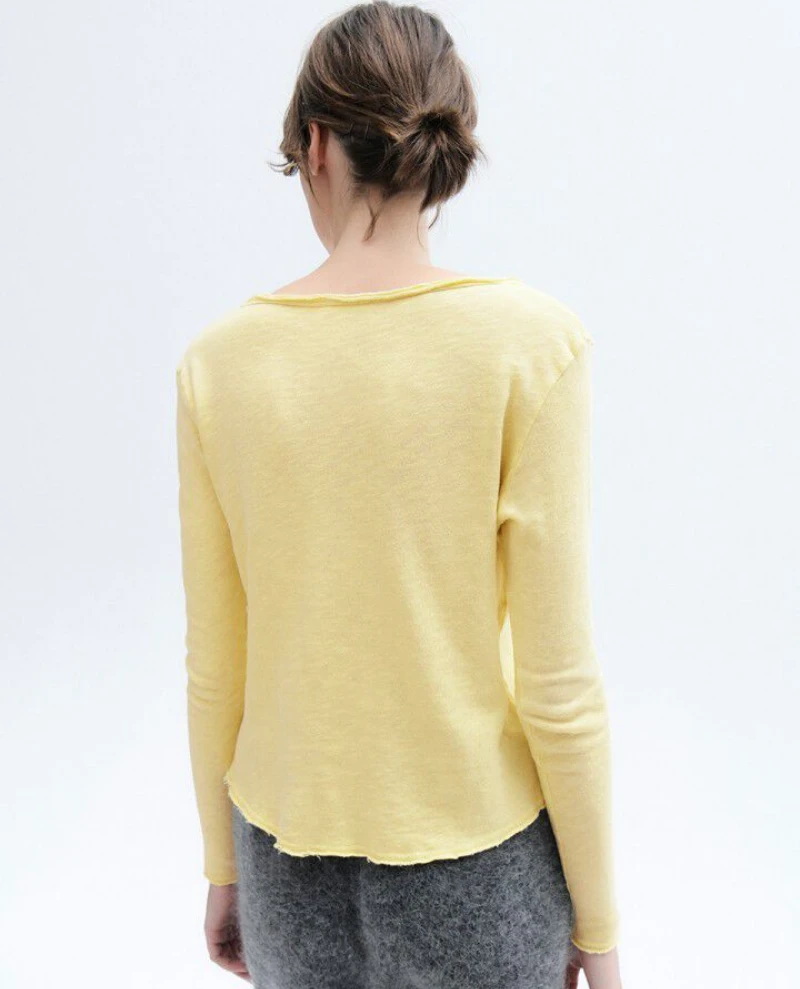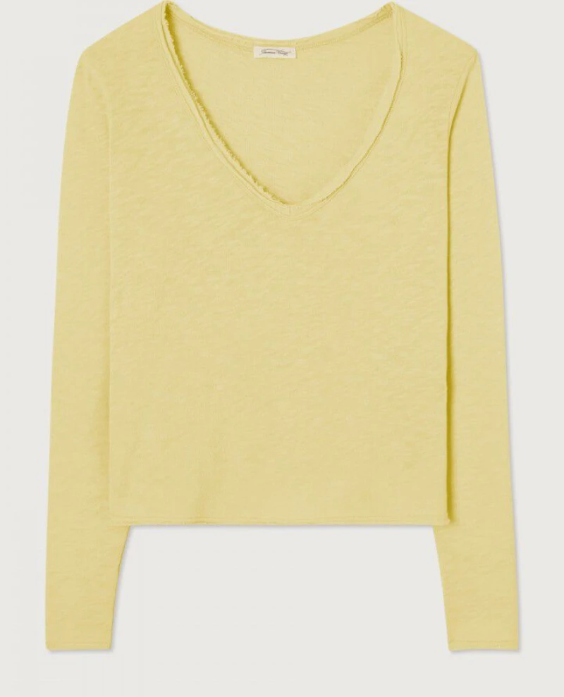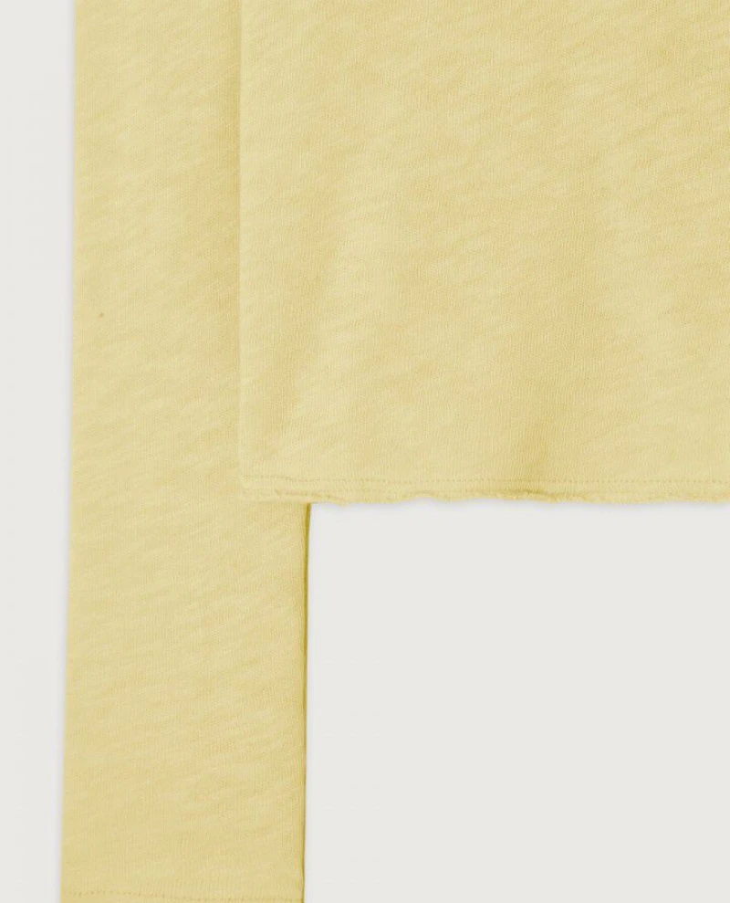 American Vintage Sonoma Pistachio Long Sleeve T-Shirt, a yellow toned cotton top. With a soft handle and light weight, the sonoma is finished with a scoop v-neckline and raw edging.