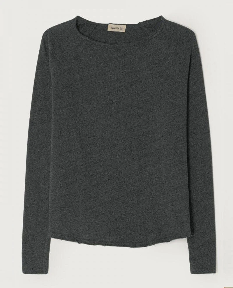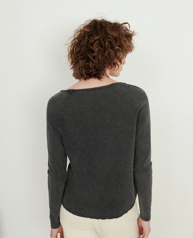 American Vintage Sonoma Vintage Black Top, a dark charcoal grey long sleeved cotton tee with a round wide neck and a straight relaxed fit. This simple dark grey pullover top is crafted from thick cotton, making it ideal for layering. The wide neck and hem are finished with raw edges giving it a casual feel. Also available in white, pink and blue.