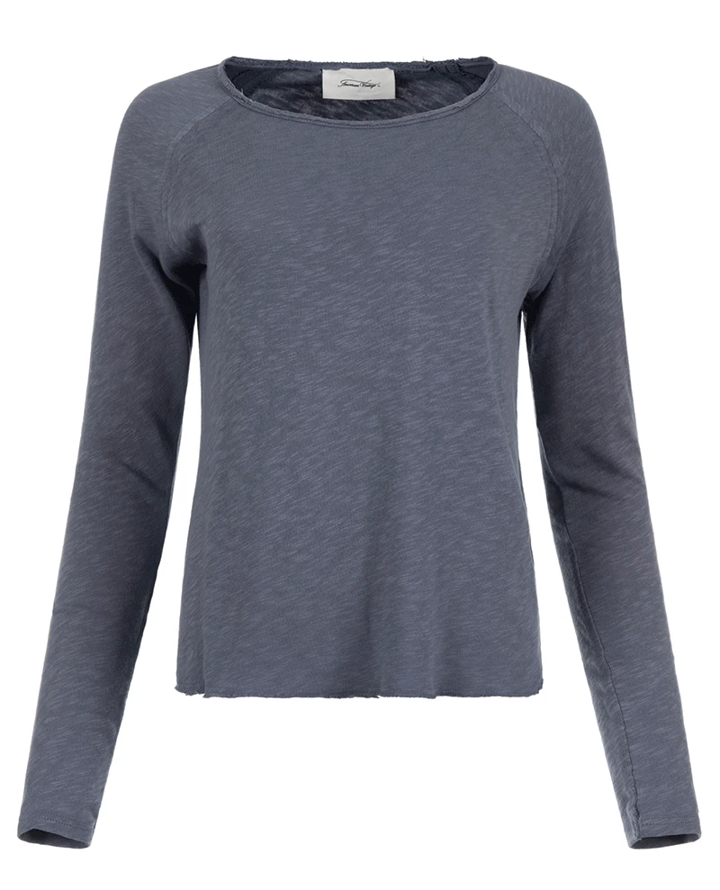 American Vintage X Biscuit Storm Blue Sonoma T-Shirt, an exclusive colour range of the best selling Sonoma t-shirt, created just for Biscuit. The long sleeved cotton Sonoma t-shirt is by far the best selling top at Biscuit so for Autumn 2021, we have designed a trio of limited edition colours inspired by the trends for Autumn.Â