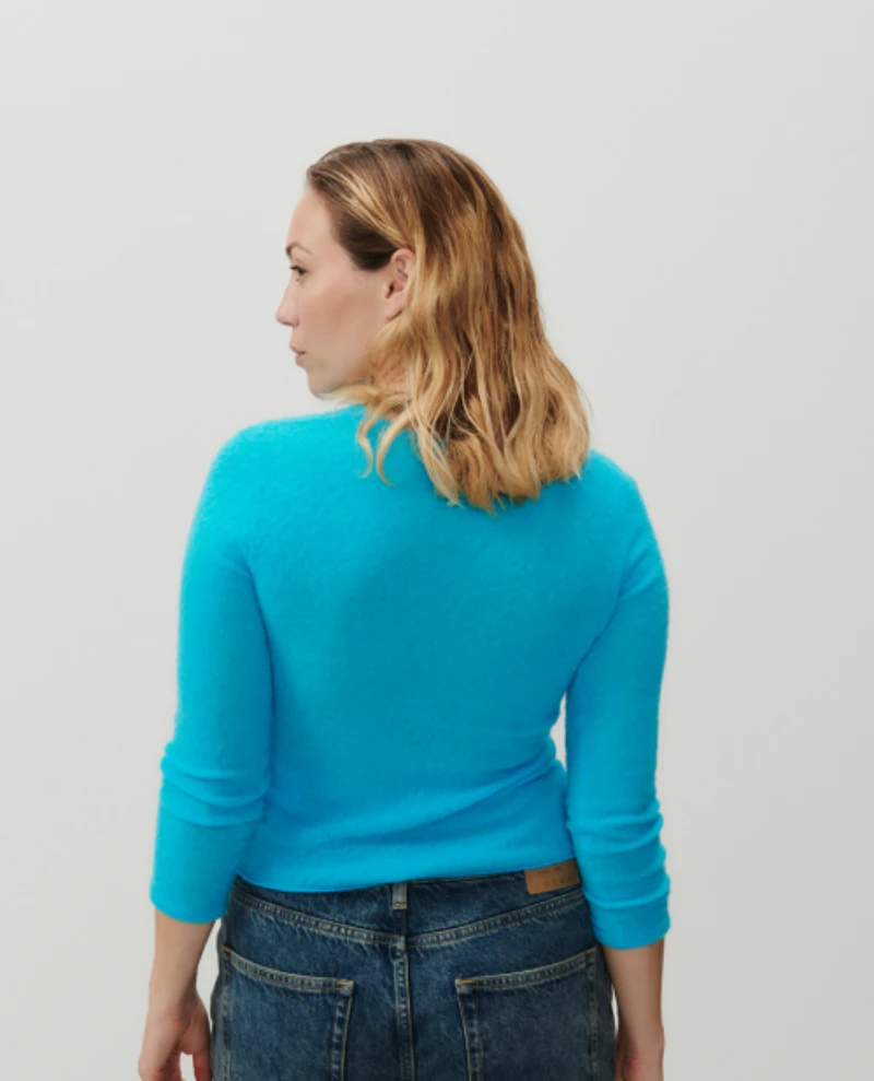 This American Vintage Xinow Splash Blue Round Neck Knit provides a comfortable and snug fit with its fine knit construction and ultra soft handle. Its vivid blue tone is easy to style and perfect for any occasion. Look good and feel great with this knit jumper.