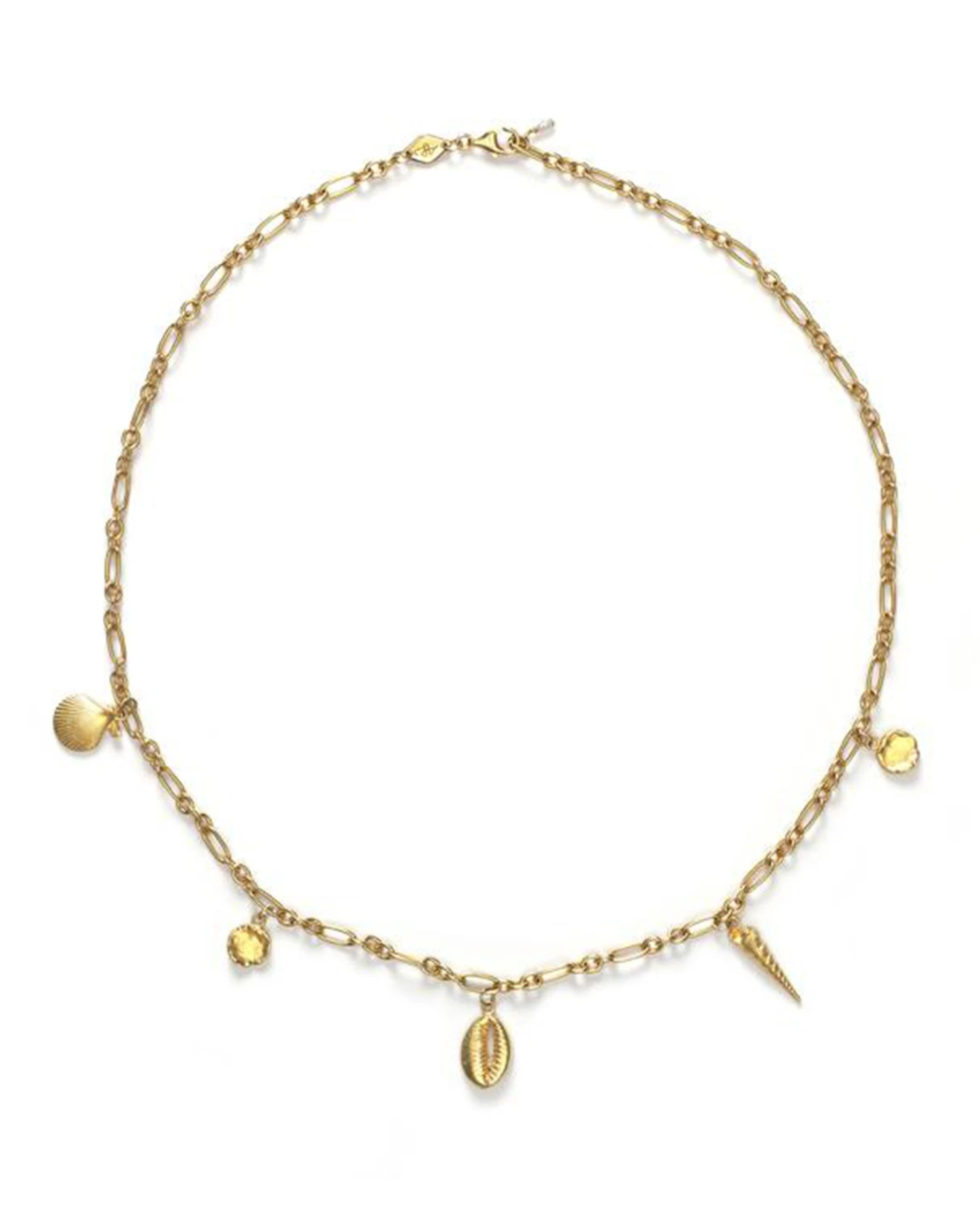 Anni Lu Summer TreasureĀ Bracelet, a gold shell charmĀ bangle with a lobster claw clasp and small cowry shell and scallop shells.