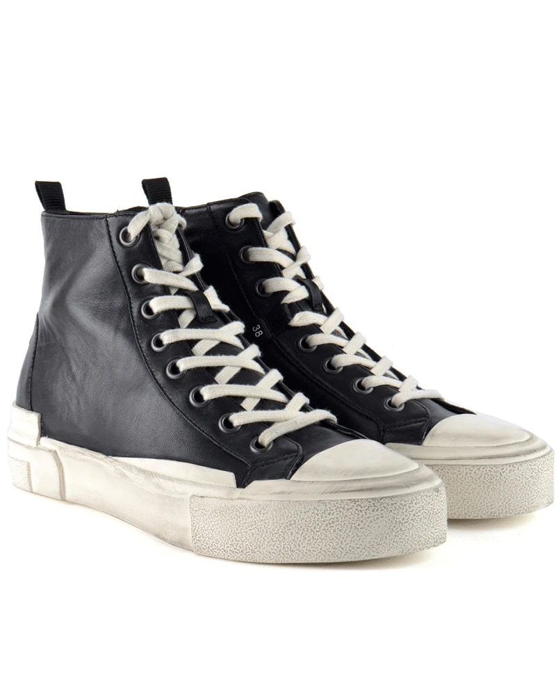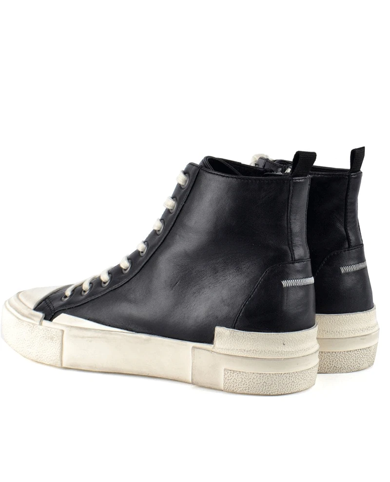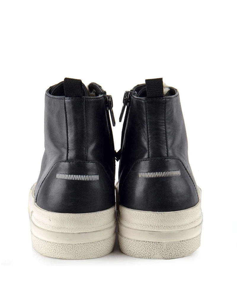 Ash Ghibly Black Leather Trainers, a black and white pair of high top sneakers with distressed white rubber soles and white laces. Fastening with a zip on the inside the Ash Ghibly high tops has a thick platform sole for comfort.
