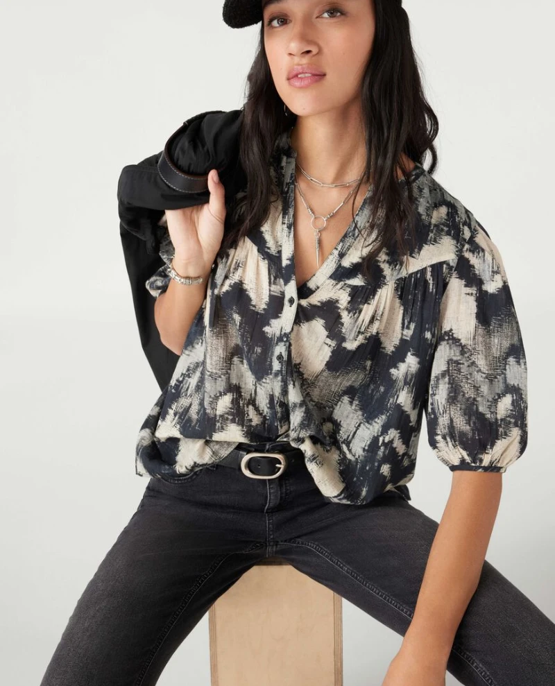 Ba&sh Alabama Black Shirt, a lightweight and elegant shirt in black and white tones. The floaty shape makes it a great choice for summer, with short, gathered sleeves which fall to the elbow and pleat detail to the back. Complete with button down front and a rounded neckline.