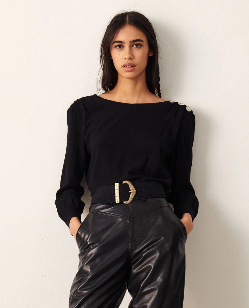 Ba&sh Marty Black Top, a sleek black top with buttoned shoulder. With a low, draped back and long sleeves, the Marty has a sleek fit with crystal button detail to shoulder and a boatneck neckline.