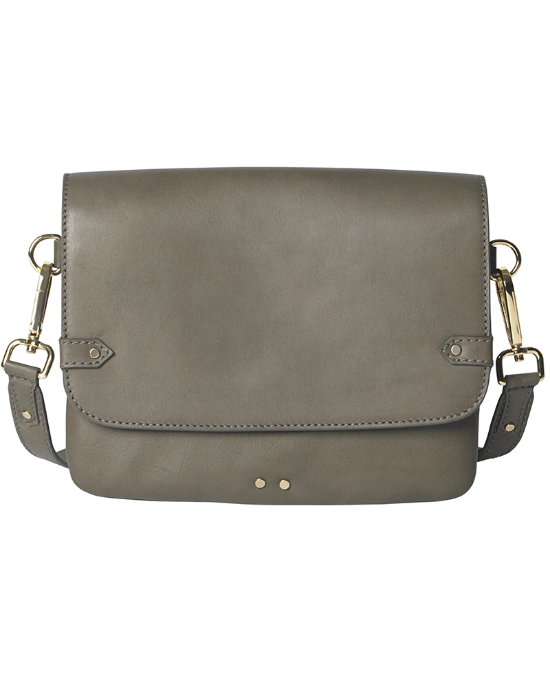 Beck Sondergaard Adelie Army Green Bag, a dark khaki green crossbody bag with a detachable strap and metal detailing. Designed with two interior sections and an internal zipped pocket this small dark olive green bag has a striped fabric lining.