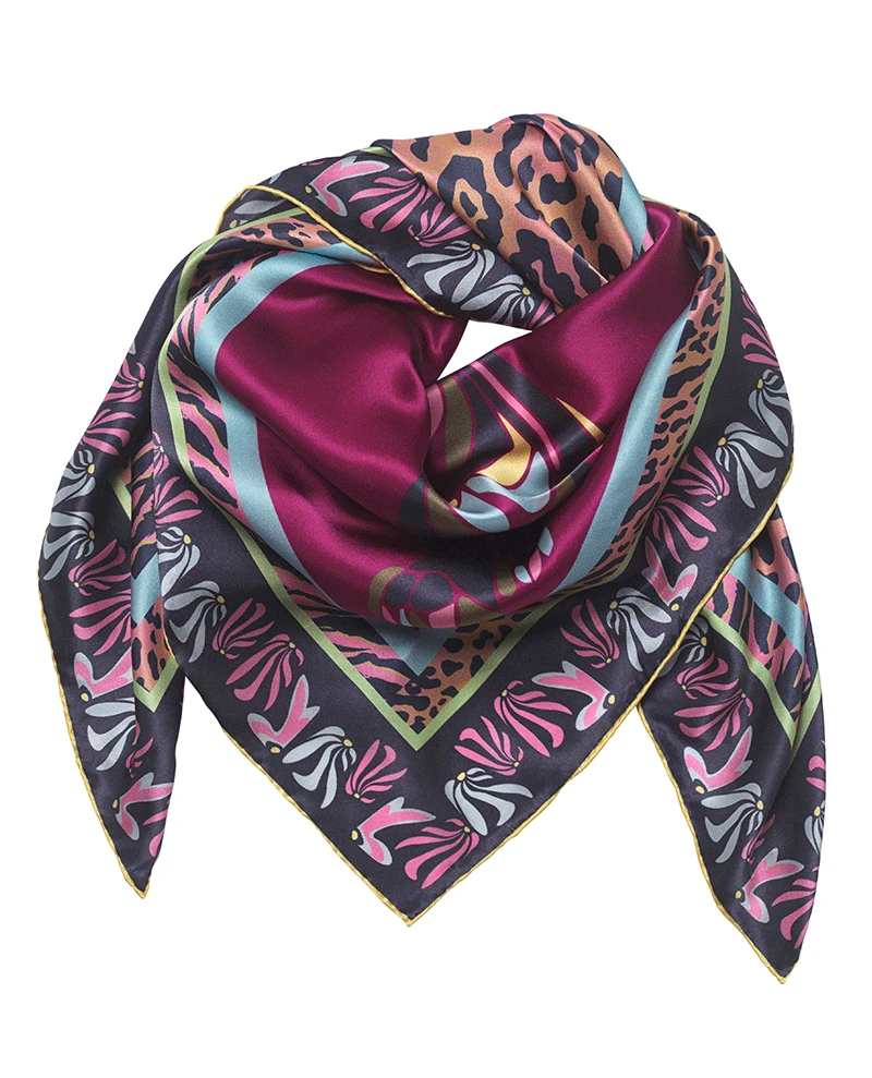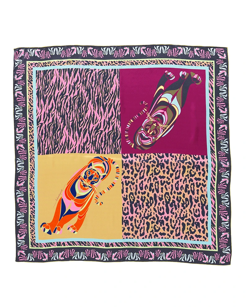 Beck Sondergaard Anakin Multi Scarf, a silky square scarf covered in a multi coloured range of animal prints. This large square scarf has 4 differing designs from zebra and leopard print to colourful tigers.