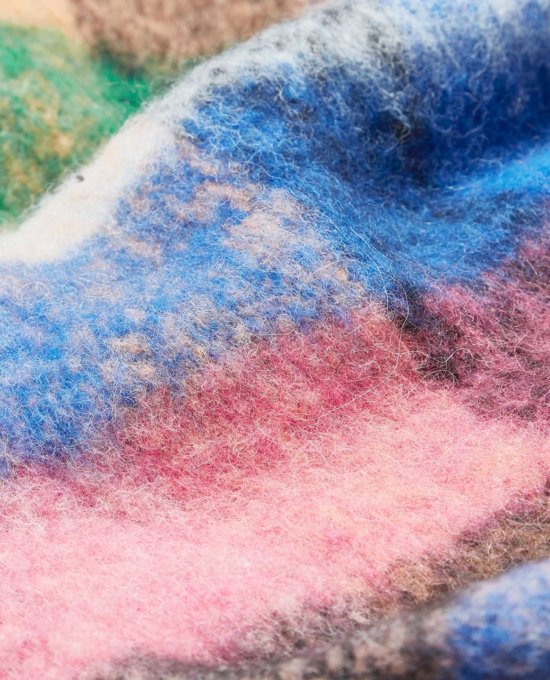 Beck Sondergaard Check Sky Scarf, a colourful scarf in blue, pink and green tones. With a soft handle, this alpaca mix scarf is finished with decorative tassel detailing to ends.