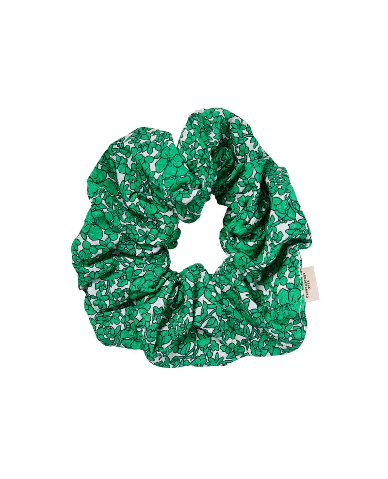 Beck Sondergaard Deanna Green Scrunchie, a cotton floral hair scrunchie with a stretchy band inside in a rich fern green. The perfect hair accessory for the season.