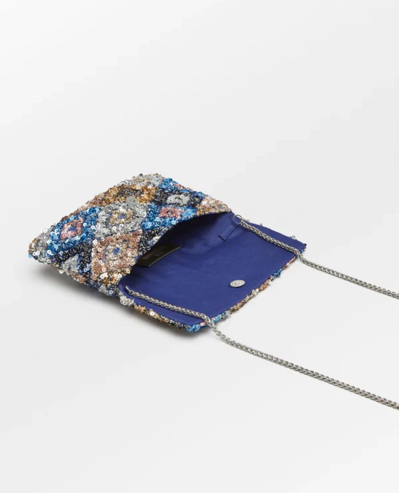 Beck Sondergaard Gray Glisten Paradi Bag, an elegant slim shape and a tweed inspired textile, decorated with pearls and shiny sequins. Complete with long metal chain and magnetic closure, add sparkle to your outfit.
