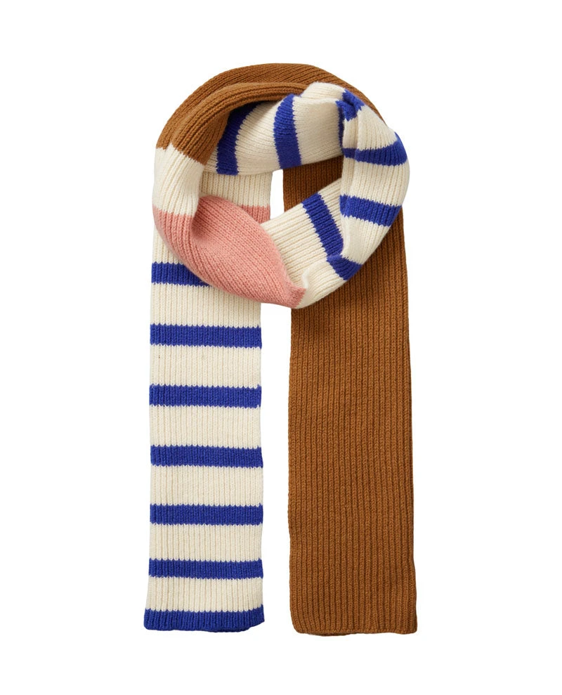 Beck Sondergaard Lolo Cass Multi Scarf, a ribbed wool and cashmere mix scarf. In caramel, blue, white and pink tones with solid and stripe detailing.