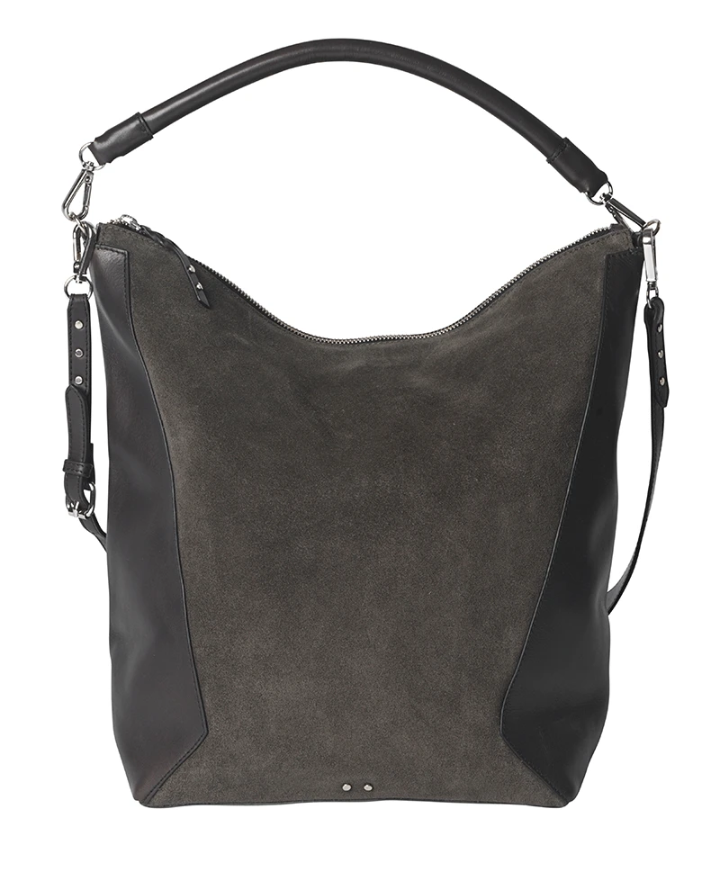 Beck Sondergaard Mix Everly Grey Bag, a dark grey slouchy shoulder bag with a detachable cross body strap. The perfect size of handbag to tote your everyday essentials in and made from a soft shade in a neutral grey suede that will go with everything.