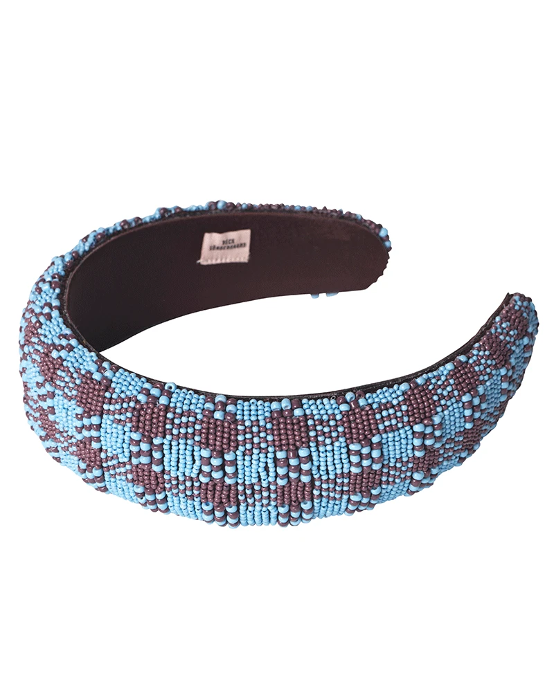 Beck Sondergaard Mukka Fig Hairband, a padded and checked blue and purple hair band covered in small beads.