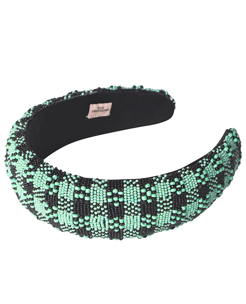 Beck Sondergaard Mukka Green Hairband, a padded and checked black and green hair band covered in small beads.