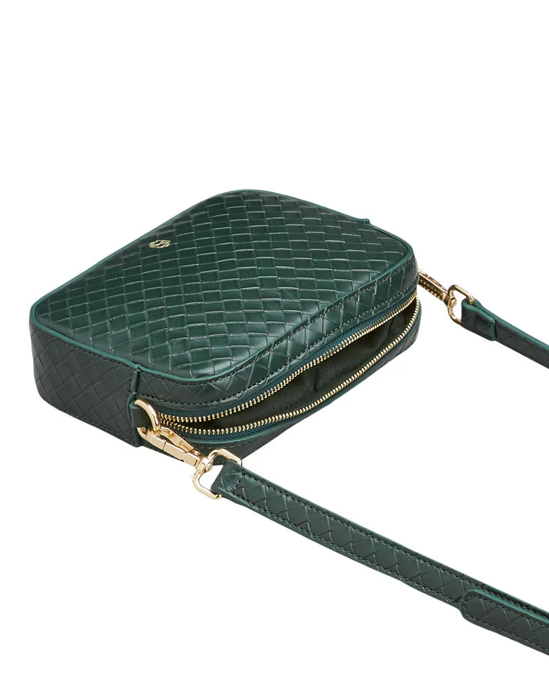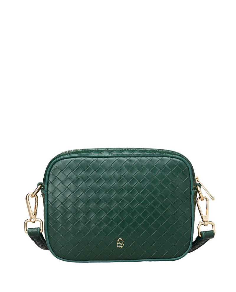 Beck Sondergaard Rallo Minnie Pine Bag, a small square bag with rounded edge. In a smoked pine green tone, this textured bag is complete with gold hardware and shoulder strap with zip closure.