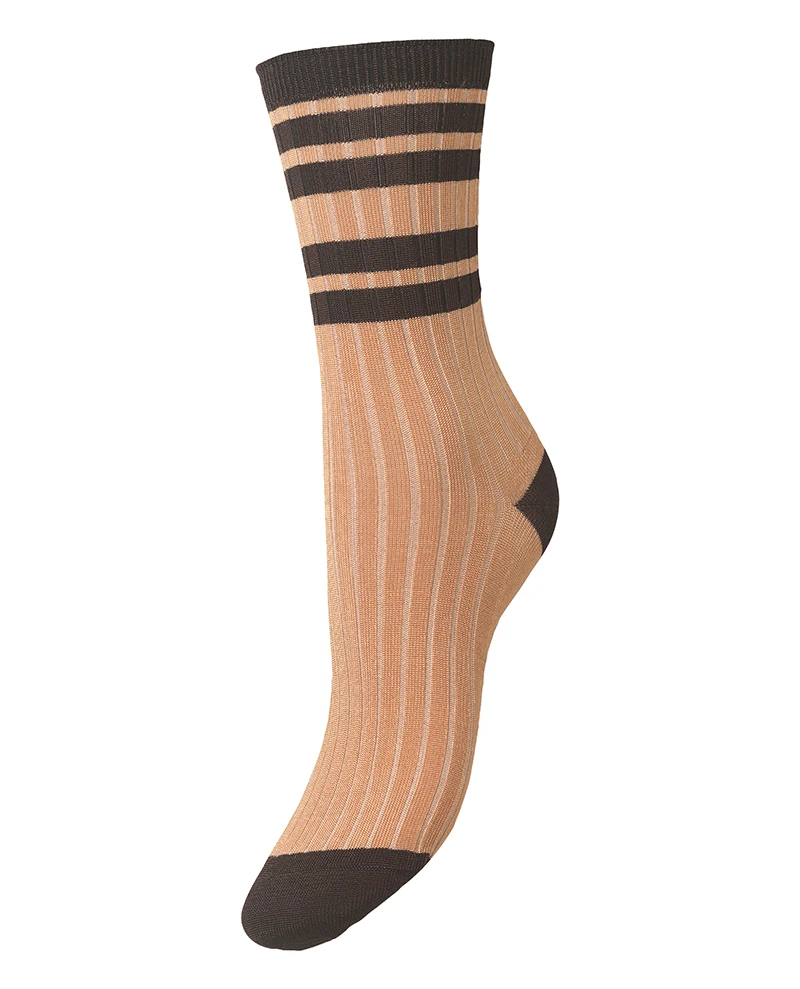 Beck Sondergaard Sportia Sand Socks, a brown pair of ribbed ankle socks made from a lightweight woven viscose blend and finsihed with brown stripes.