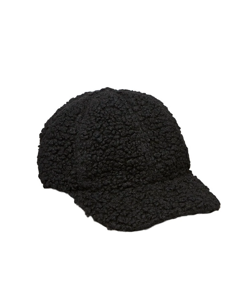 Beck Sondergaard Teddy Black Cap, a textured borg style cap in black. With contrasting blue inner and velcro strap to the back.
