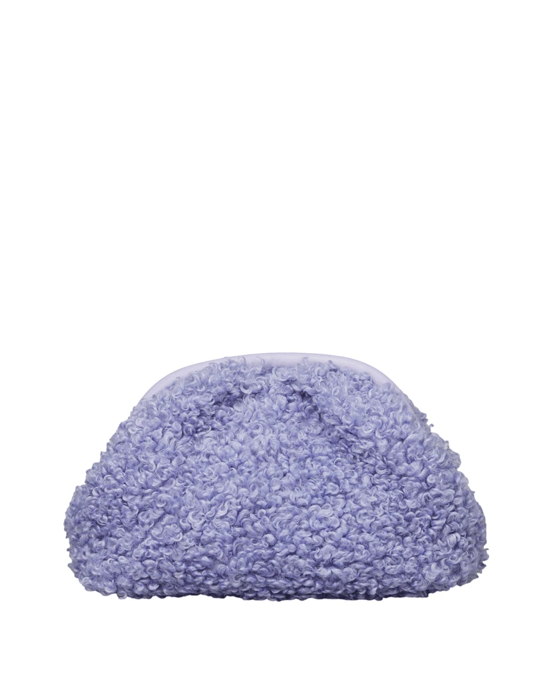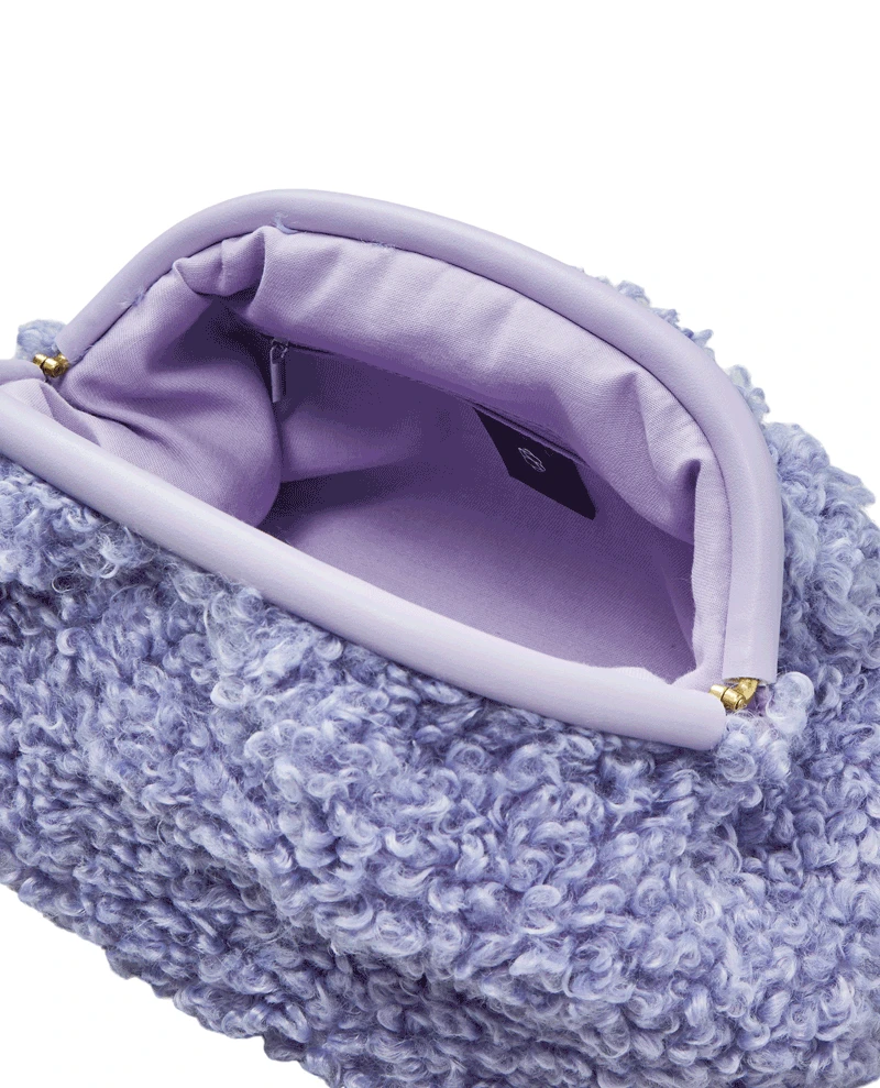 Beck Sondergaard Teddy Bonita Orchid Bag, a textured teddy clutch style bag in a purple orchid tone. With hinge open, a rounded shape and zipped pocket within, keep your items safe year round.