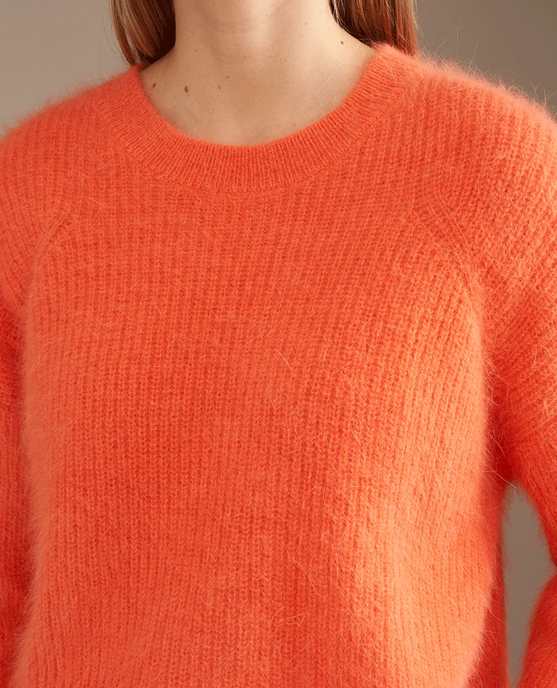 Bellerose Dataul Signal Orange Knit, a relaxed fit knit jumper. In a warm orange, the Dataul knit has loose, cropped sleeves and a rounded neckline. The finish has a fluffy quality with a soft and light handle. Designed for an oversized fit. Take your normal size to achieve the model’s look, or size down for a more fitted look.