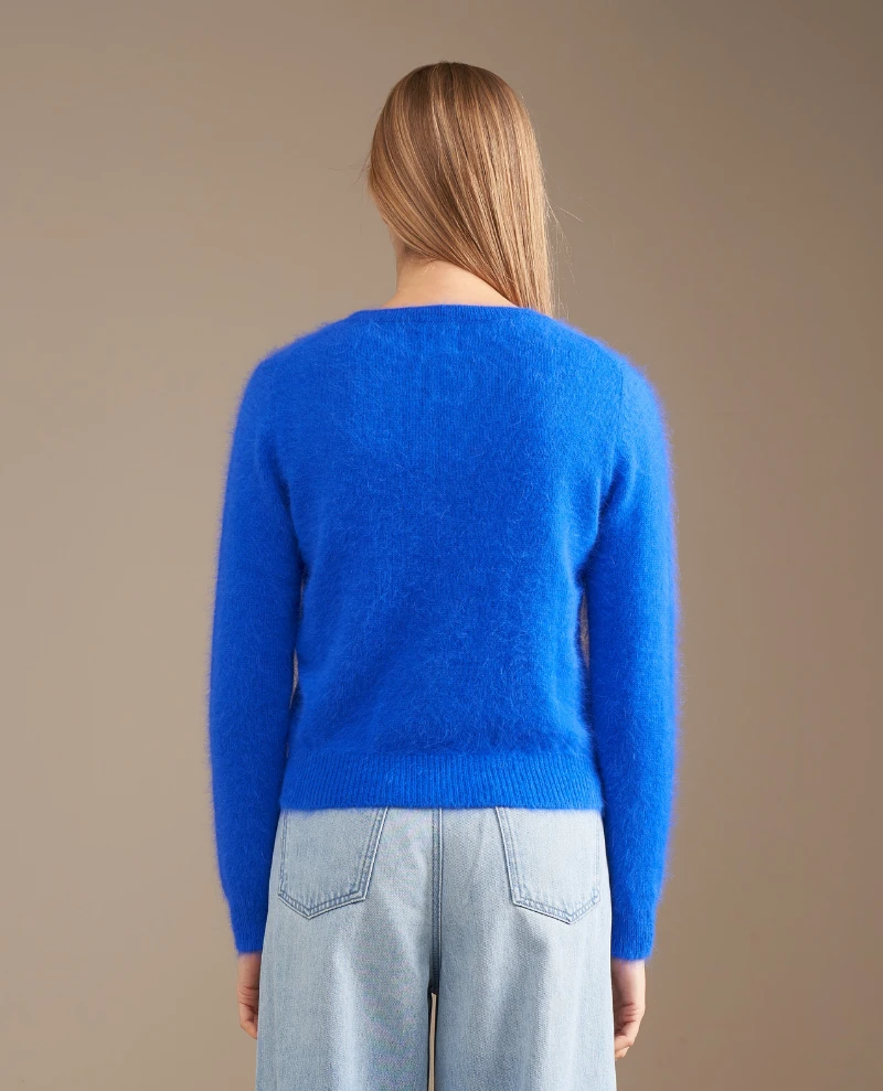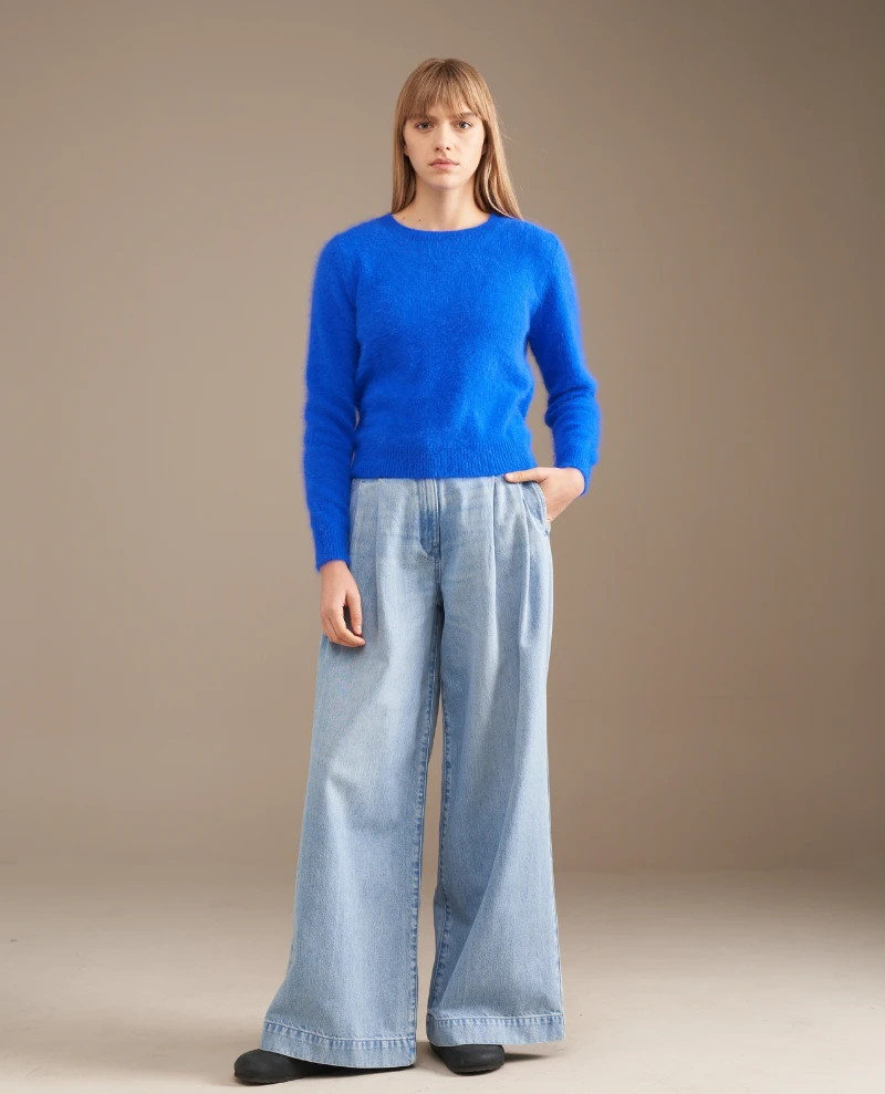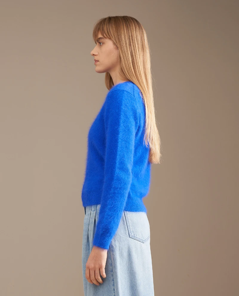 Bellerose Datti Lazuli Knit, a crewneck jumper in a vibrant blue tone. With long sleeved and a slim fit, the Datti is a bestseller year after year and introduced this year in this Lazuli blue. With a soft and fluffy texture.