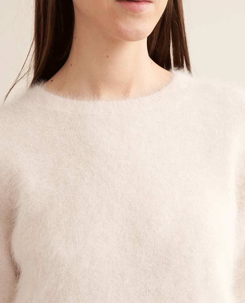 Bellerose Datti Parchment Knit, a bestseller year after year. This is a neutral cream toned knit with a fine, fluffy texture. With a soft handle, the Datti will keep you warm year round and has a slim fit.