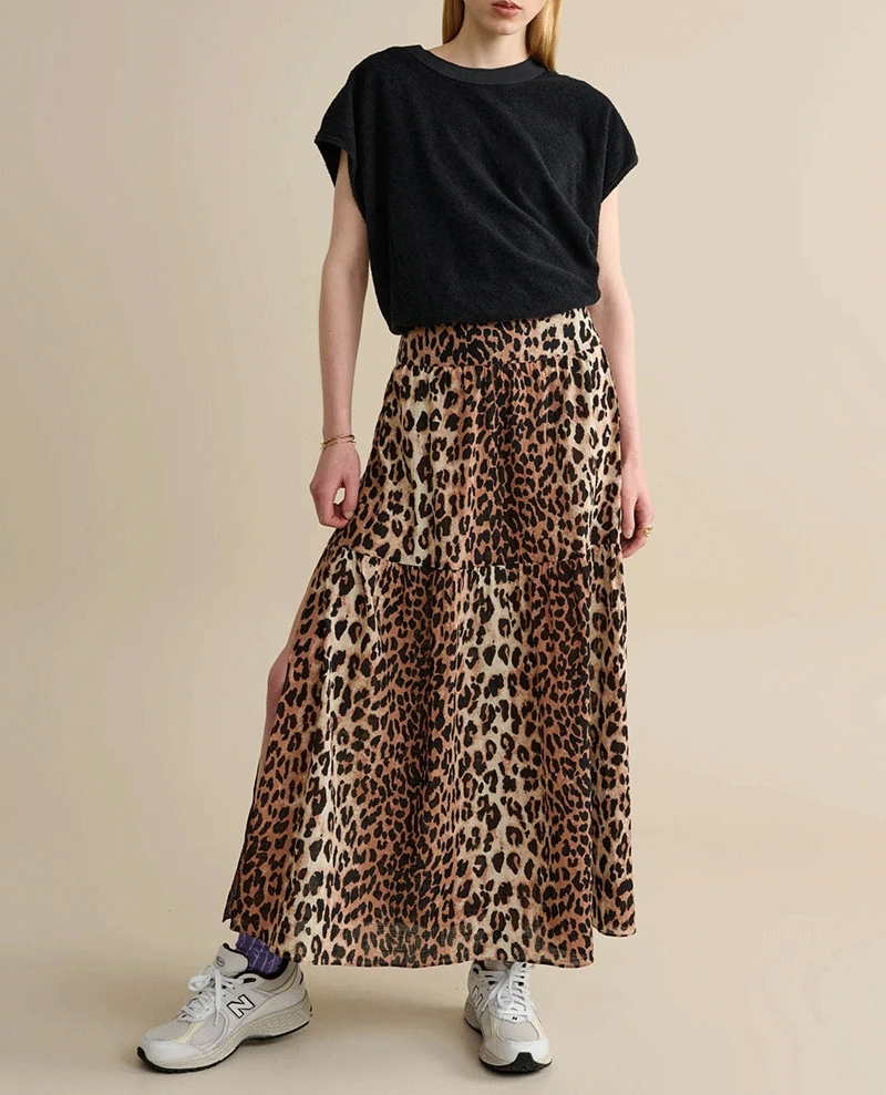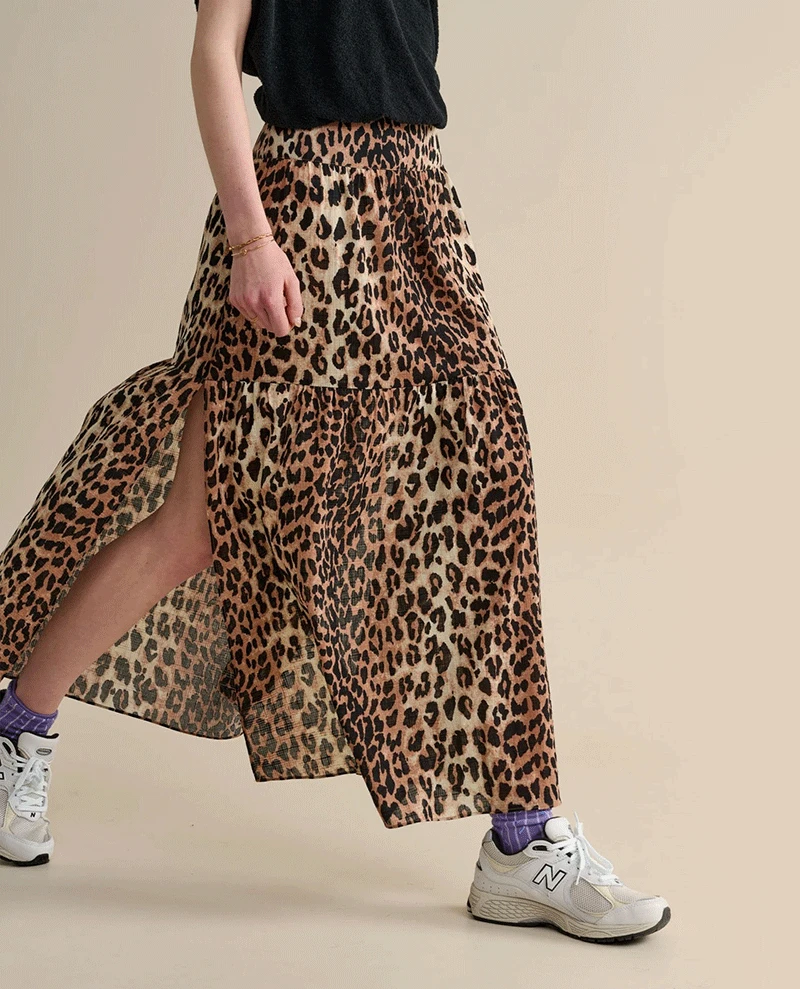 Bellerose Hozz Combo A Skirt, a brown leopard print maxi skirt with a high waist and a hidden zip fastening. Lightweight and flowy this brown animal print skirt has side slits from the knee to the hem.