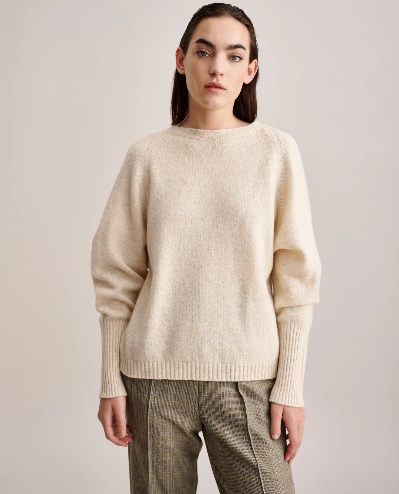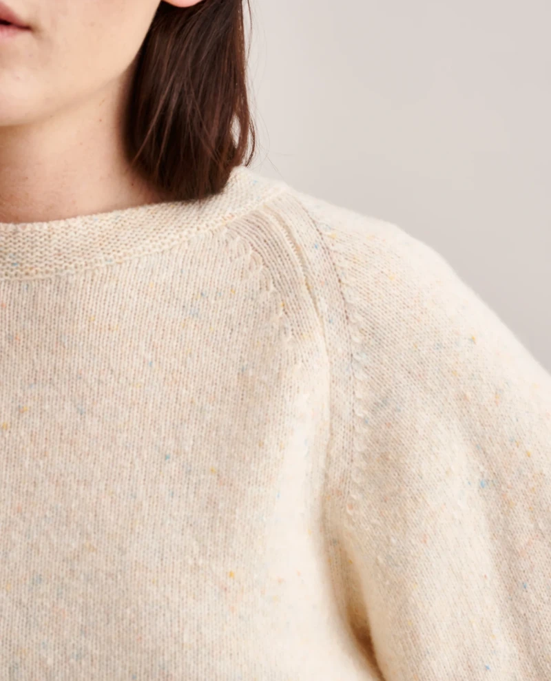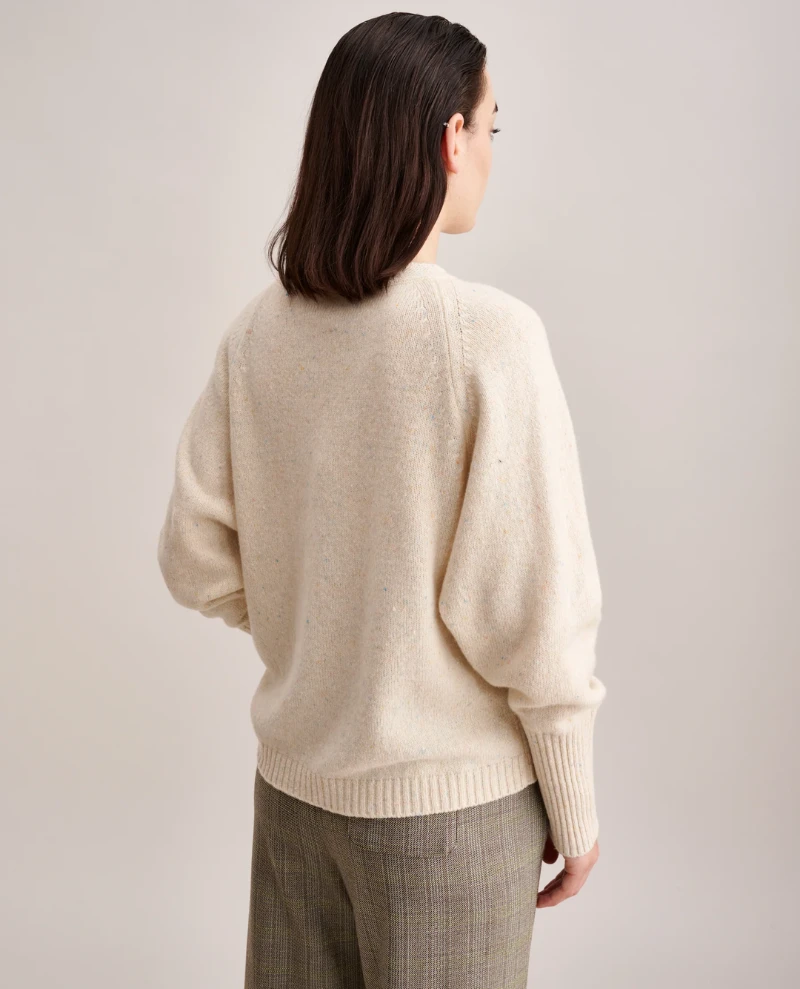 The Bellerose Kear Shell Knit is an innovative and sustainable sweater, expertly crafted in Italy. It features a wool and recycled polyamide blend and batwing raglan sleeves, for an effortlessly stylish look. Utilizing a color-changing yarn for a unique effect, this piece is perfect for everyday wear.