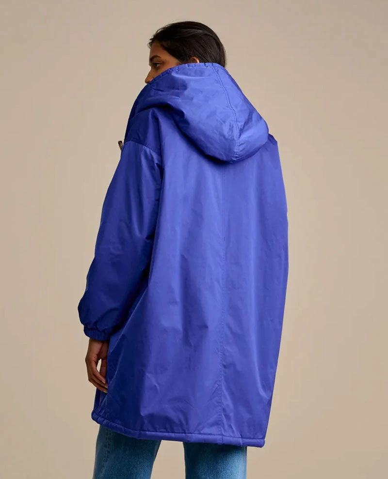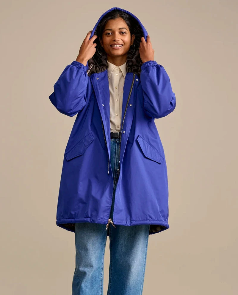 Bellerose Laos Blue Coat, a bright blue oversized coat. Complete with large hood, buttoned pockets and leopard print lining.