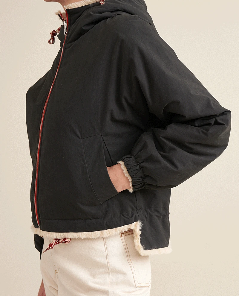 This Bellerose Loud Pirate Jacket is perfect for braving the elements. Its reversible design features a water resistant outer and warm faux fur inner, with contrasting darker and lighter tones for a stylish look. The generous hood and zip closure will keep you warm and dry on any adventure. Designed for an oversized fit. Take your normal size to achieve the model’s look, or size down for a more fitted look.