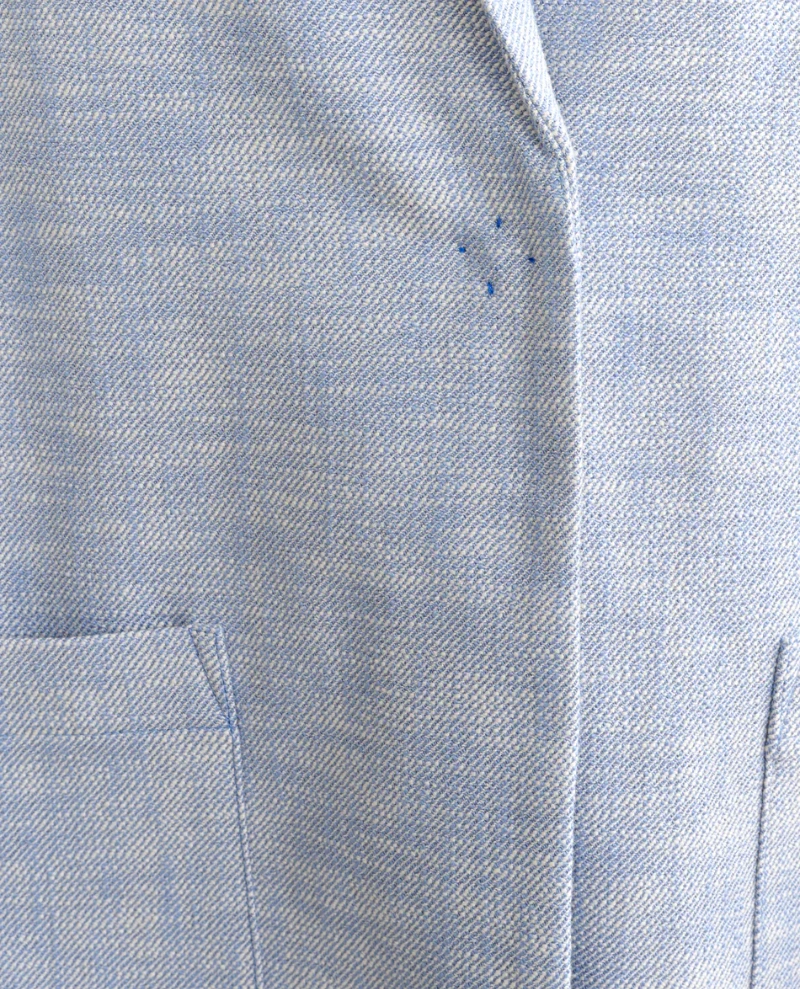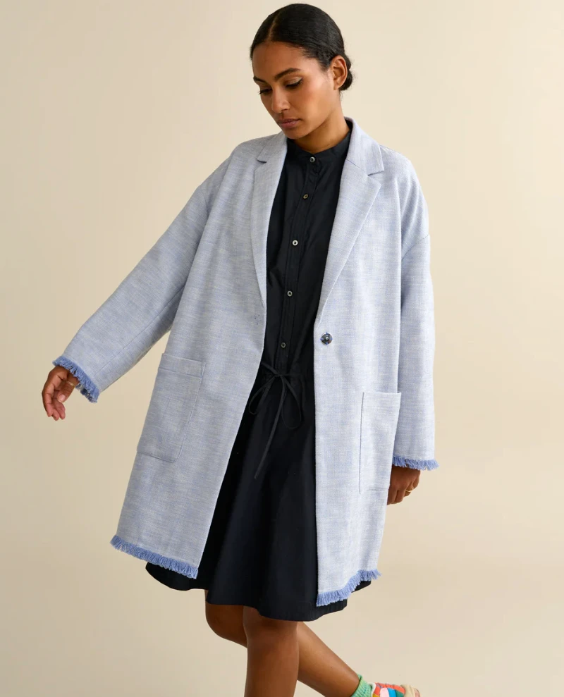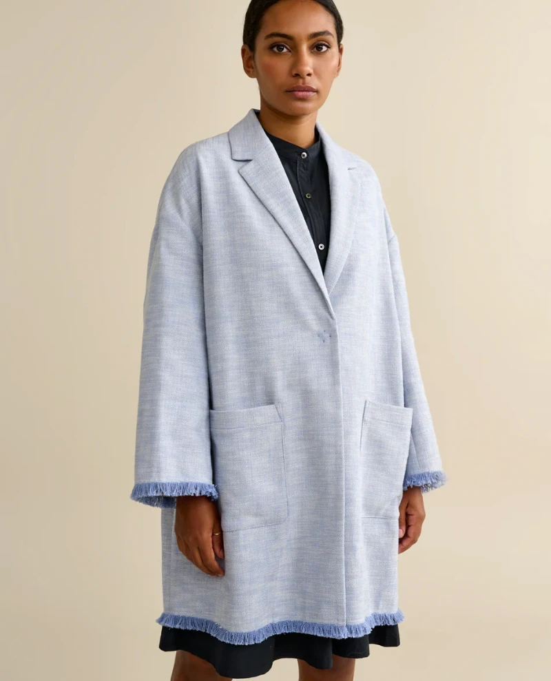 Bellerose Vittel Coat, a textured cotton blend coat in soft pervenche blue. The Vittel coat is both minimalist and dramatic, with a sleek, oversized shape with unique notched lapel, dropped shoulders, and front patched pocket. It is finished with fringed edges for a subtle Boheme-like touch.