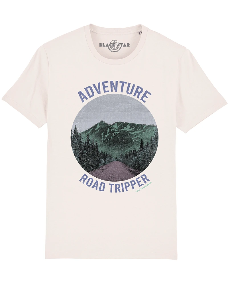 Black Star Off White Adventure Road Tripper T-Shirt, a creamy white short sleeved t-shirt with a round neck and a straight fit. Crafted from soft and luxurious cotton these retro slogan t-shirts from new brand Black Star 1980 have a vintage feel that we love. The off white adventure road tripper tee is designed with blue typography and a circular image of a tree lined road leading towards a mountain printed on the front.