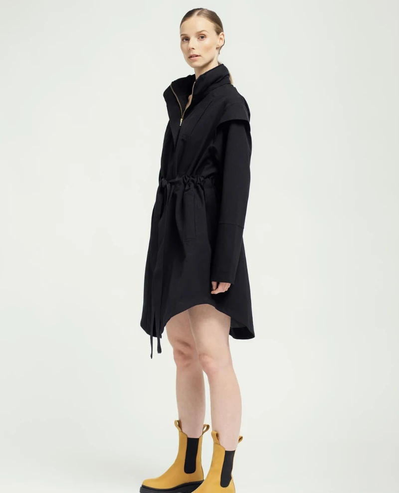 BRGN Monsun New Black Coat, a waterproof raincoat with a slightly oversized fit. In a timeless deep black, the jacket is complete with fashionable cap sleeves, functional tunnelled belt, and hidden hood in collar. Extremely warm, the Monsun can be worn throughout the year and has a waterproof rating of 20.000 mm meaning they can withstand both heavy ran and wind.