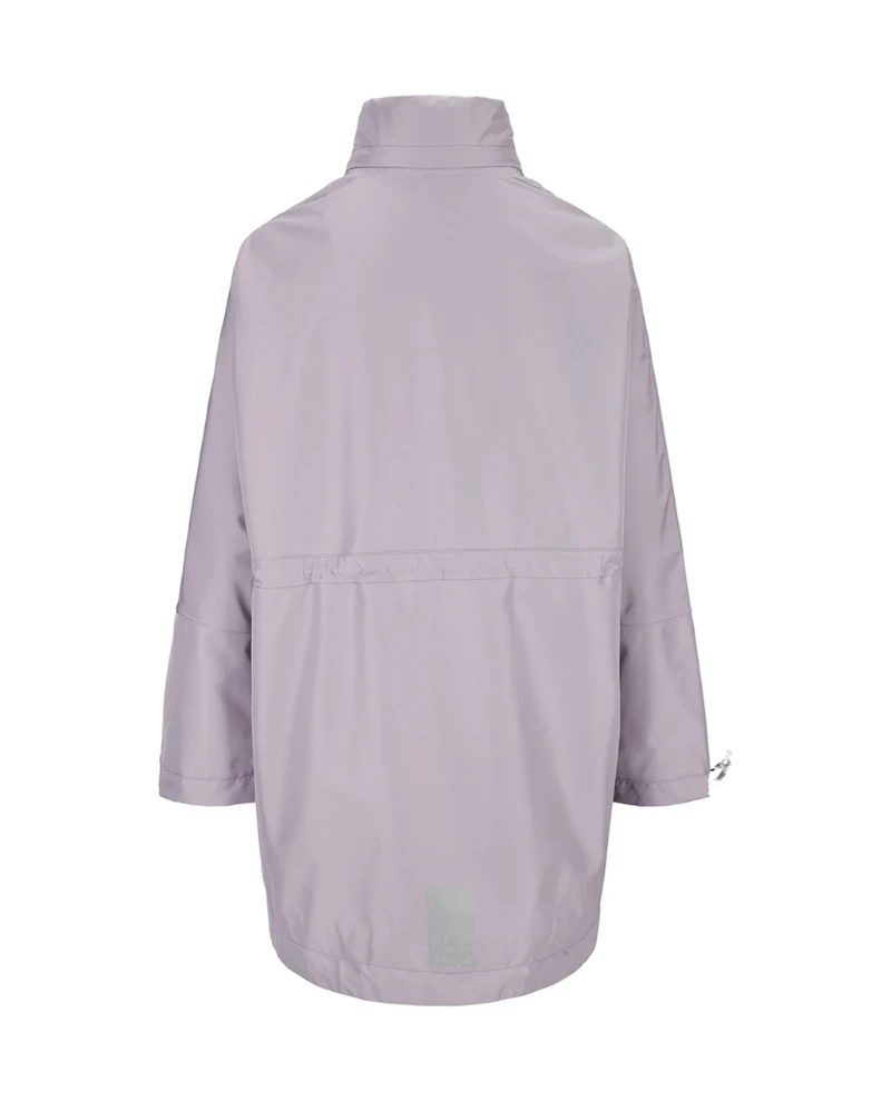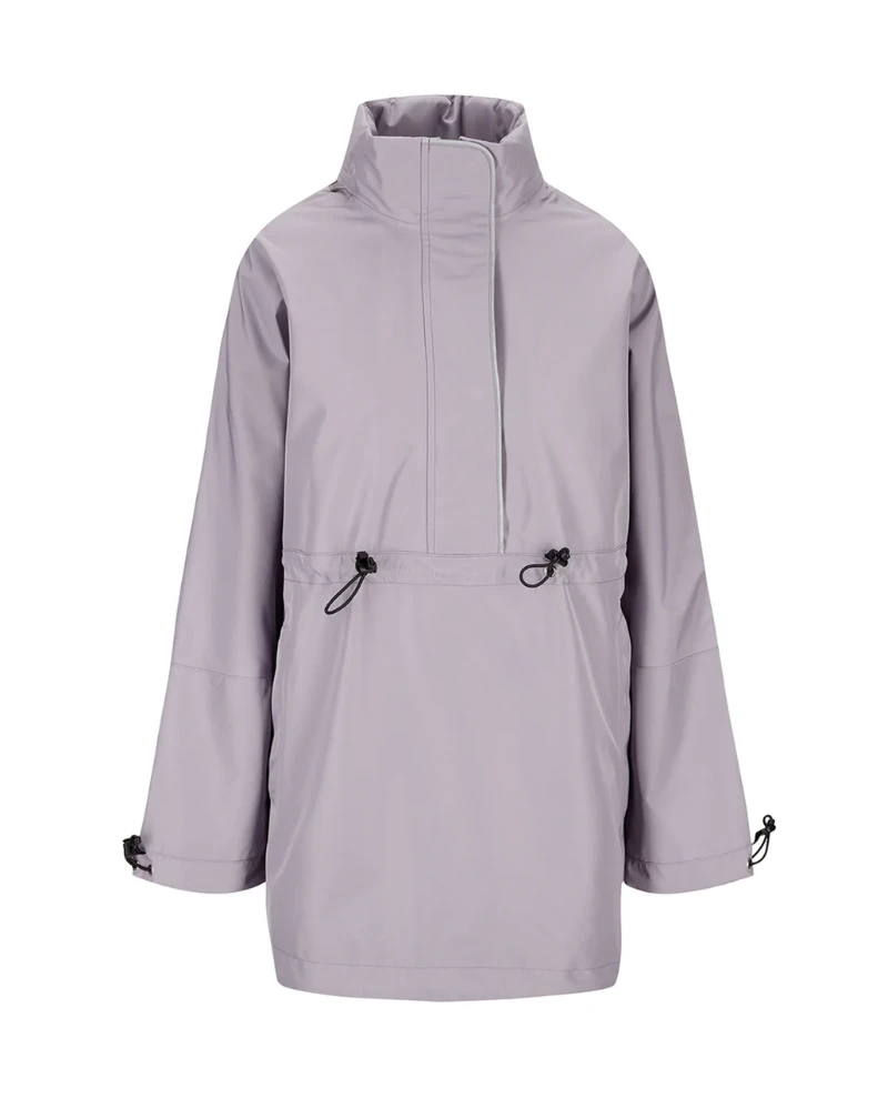BRGN Regnbyge Lilac Anorak, a waterproof pullover anorak with an oversized boxy fit. This rain jacket is made from 100% recycled and biodegradable outer fabrics in a pale lilac tone. Complete with a drawcord adjustable hem, waist and cuffs, it is complete with side welt pockets and half zip opening with reflective details.