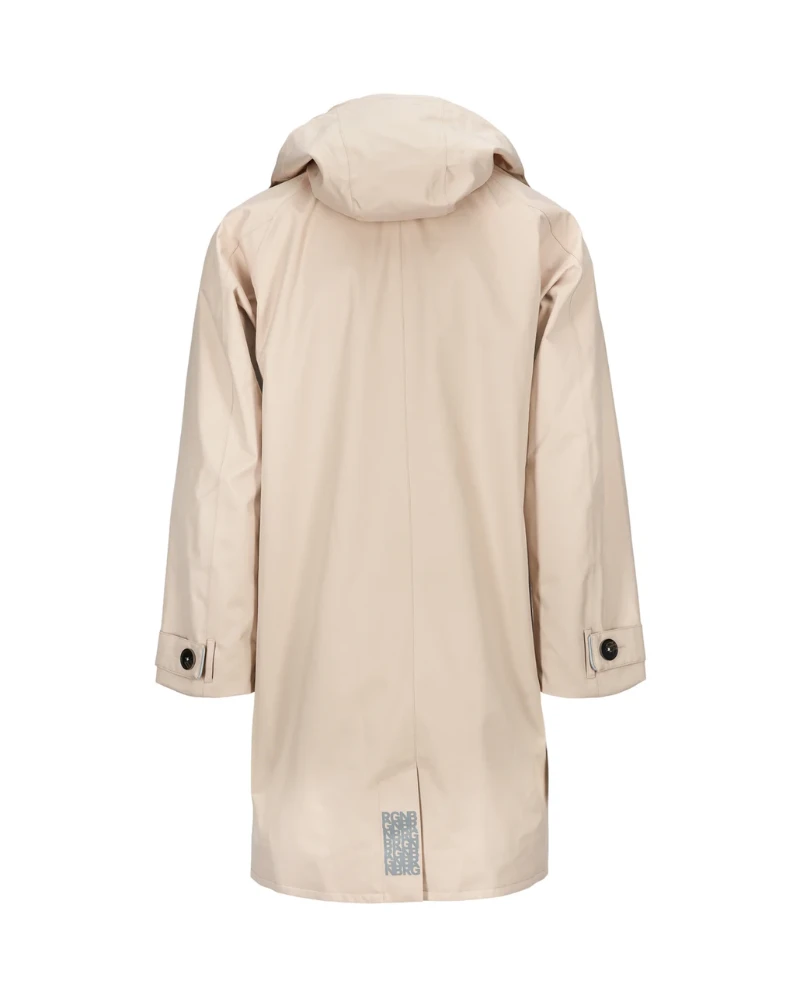 BRGN Vind Sand Coat, a waterproof rain jacket made from recycled fabric. The coat comes with a removable hood under collar, side welt pockets, inner chest pocket and reflective details. This unisex style makes it both suitable for men and women – with ladies recommended to size down as this has an oversized fit.