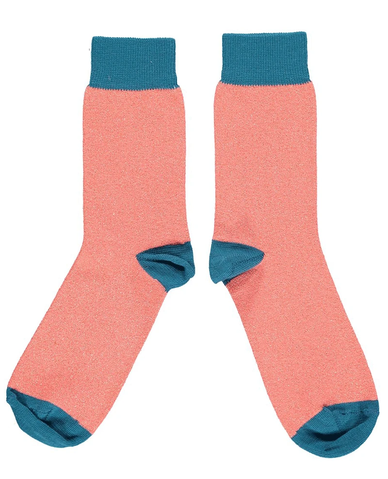 Catherine Tough Cotton Glitter Teal Socks, a sparkly pair of coral pink ankle socks with glittery teal blue trims.