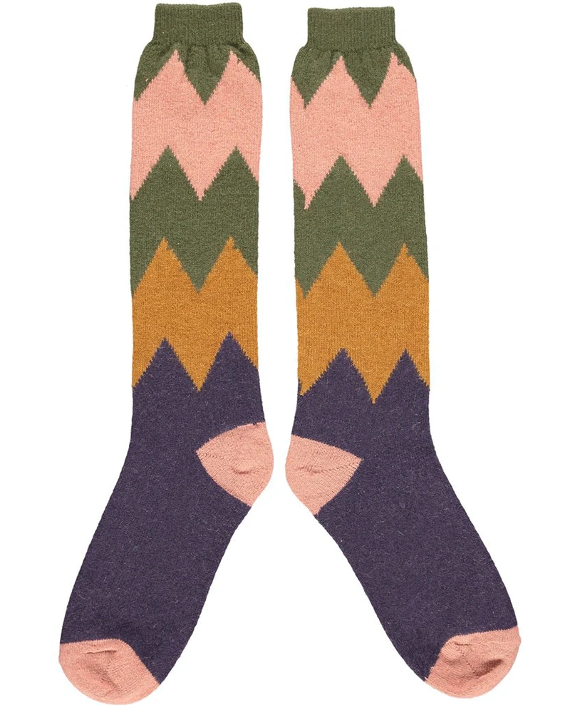 Catherine Tough Horses Lambswool Knee Socks, a soft and durable pair of stretchy knee high socks which are hand spun in Portugal from Italian wool. Covered in a multi-coloured zig zag stripe these high boot socks make a lovely gift.