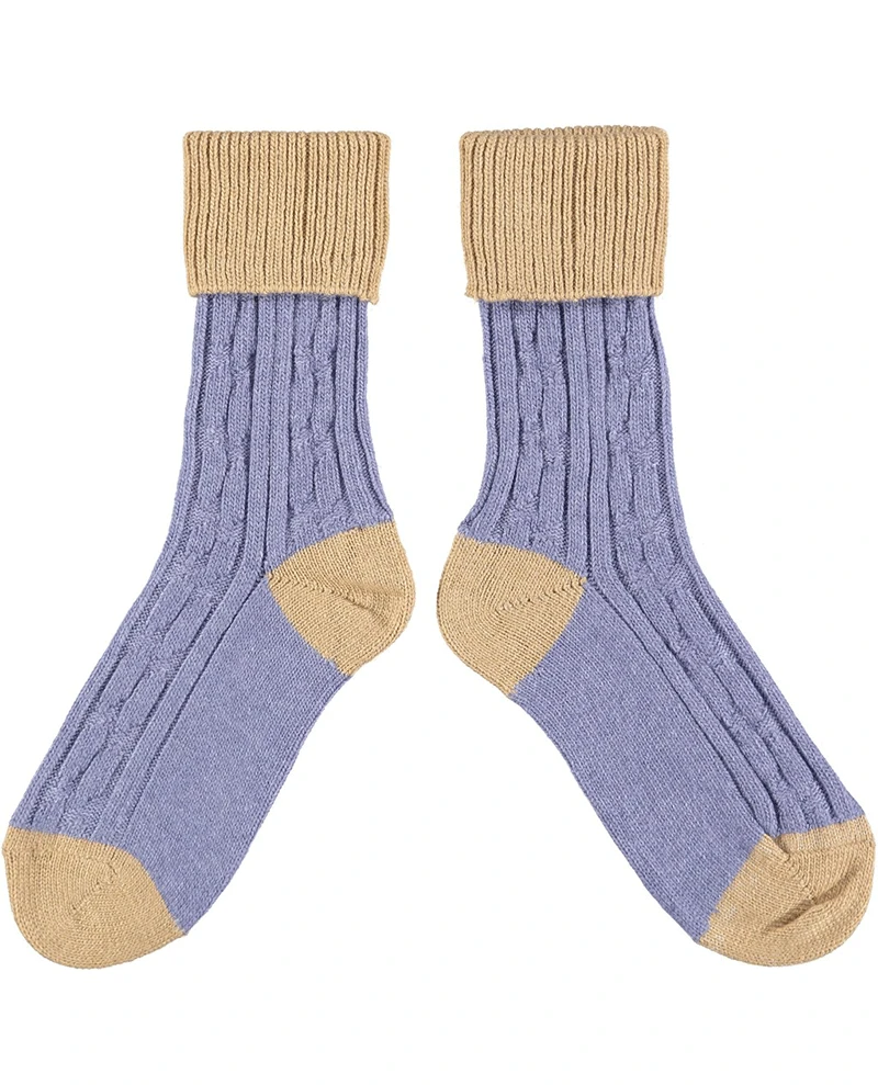Catherine Tough Slouch Socks Lavender/Copper, a soft ribbed pair of lilac slouchy house socks with brown heels and toes. Lightly elasticated these stretchy bed socks make an excellent gift.