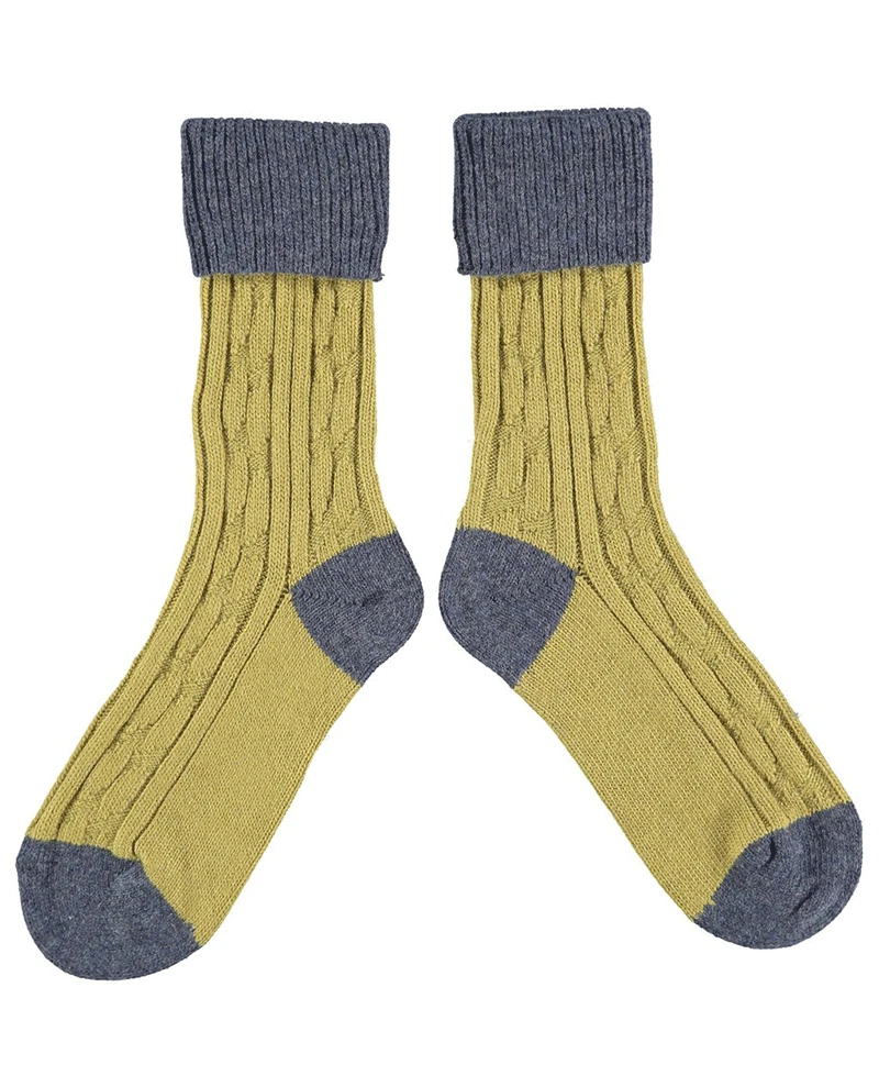 Catherine Tough Slouch Socks Lime/Slate, a subtle lime green pair of stretchy ribbed bed socks with dark grey heels and toes. Crafted from a woollen blend these comfortable and cosy house socks are a lovely gift idea.