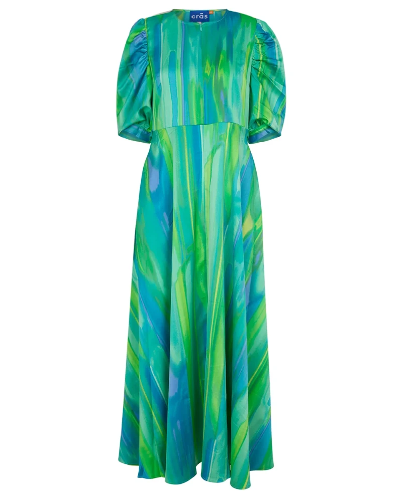 Cras Kayla Acid Waterfall Dress, a generously sized maxi dress with volume and stylish short puff sleeves. Hidden zipper at front chest and a tie at the back of the waist complete the look.