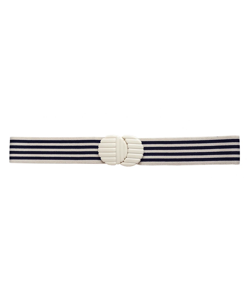Des Petits Hauts Pigale Navy Belt, a stretchy navy and white striped waist belt with a white plastic clasp.