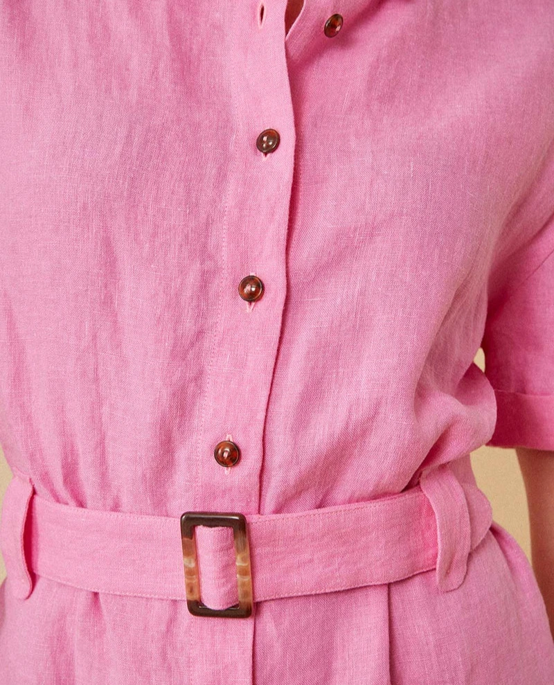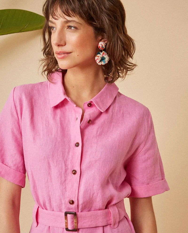 Des Petits Hauts Tandem Dress, a chic shirt style dress in pink. With a cool silhouette, the Tandem is made from soft, lightweight linen, with cuffed sleeves and a belt at the waist.