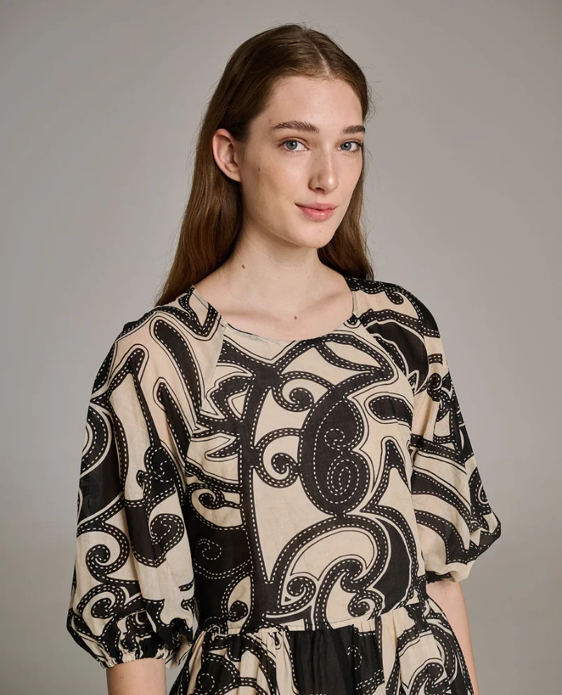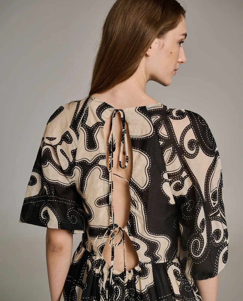 Devotion Twins Chrysi Type Dress, a flowing dress with short balloon sleeves. With a rounded neckline and bold print, the Chrysi dress has a rounded neckline and open back with drawstring detail.