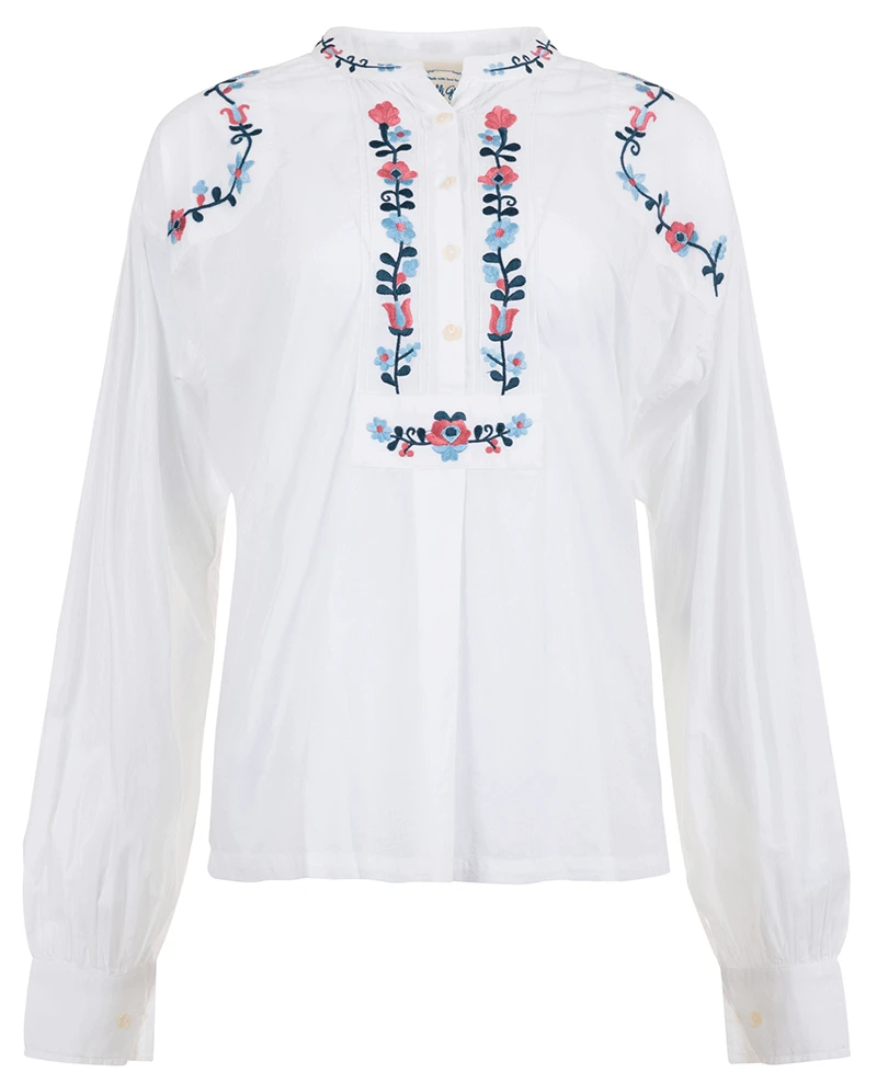 Dilli Grey Pastel White Folk Shirt, a pure white cotton shirt with long sleeves and a round neck. Covered in a multi-coloured floral embroidery this crisp white cotton top has a round neck and buttons running half way down the front.