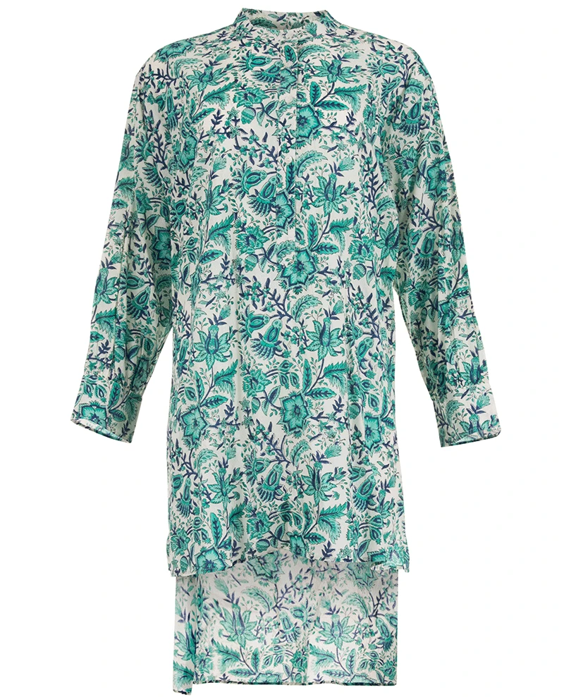 Dilli Grey Spruce Nightshirt, a blue and green floral print cotton shirt with long sleeves and a round collarless neckline. Super versatile this woven cotton top can be worn as a pyjama shirt, beach cover up or simple as a loungewear style for relaxing at home. Packaging in a matching cotton tote bag this Dilli Grey nightshirts have a long hem at the back and small buttons at the neck and on the cuffs.